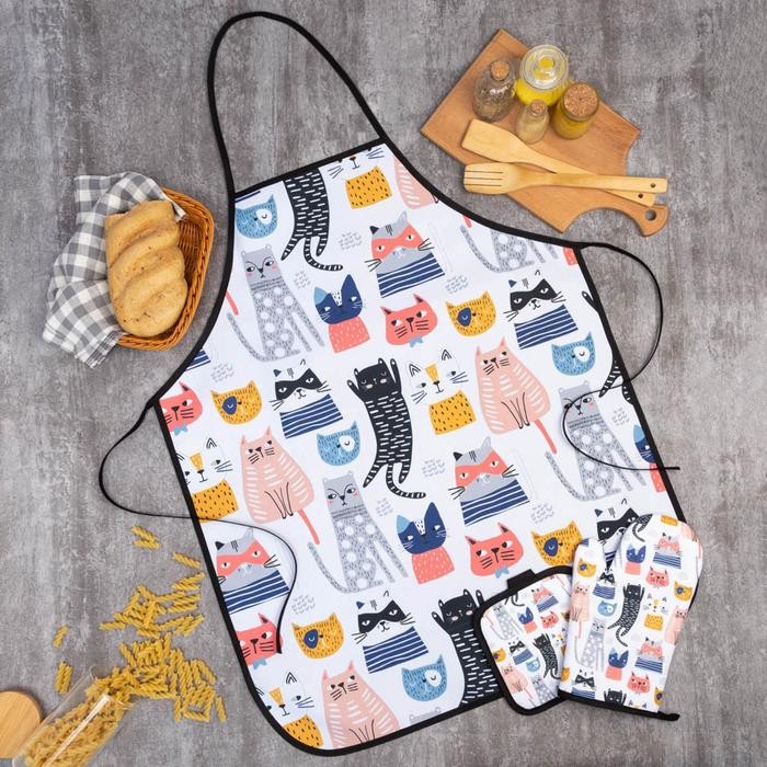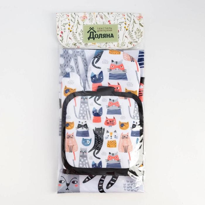 Кухонный набор Доляна «Котики» вид 2, прихватка 17*17см, рукавица 26*16см, фартук 60*80 см 100% п/э