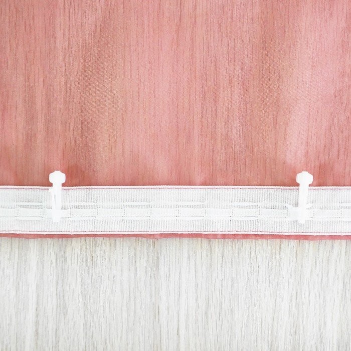 К шторе пришита лента шириной 2 см, изделие крепится к карнизу на крючки. Специальный шнурок позволяет задрапировать складки.