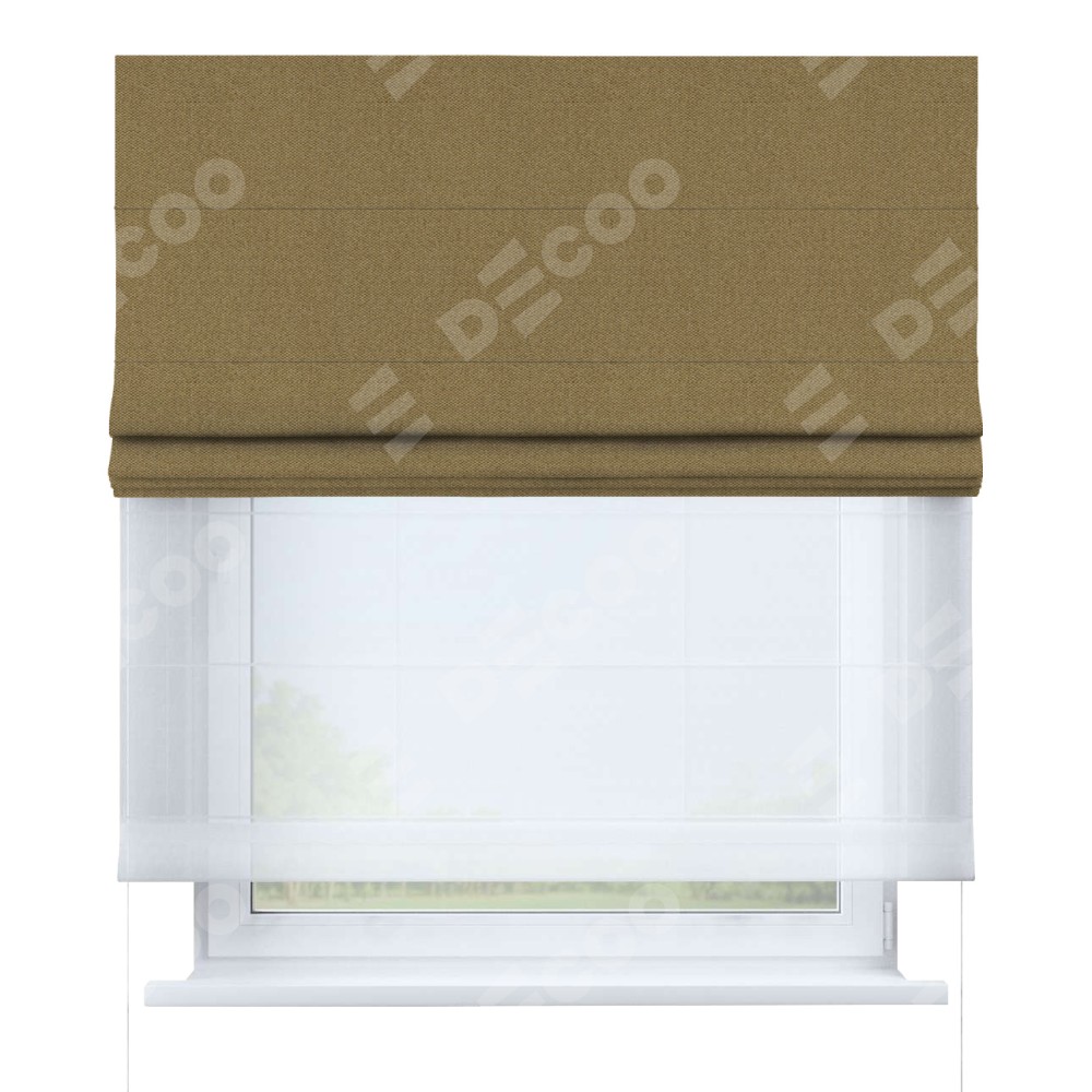Римская штора день-ночь производителя «Cortin», используется для проёма, пошита из двух полотен, с лицевой стороны лён димаут оливковый артикул 16243, вторая ткань тюль (по стандарту комплектуется тюль белого цвета артикул V-01). Имеет универсальный механизм и подходит для монтажа: на потолок, на стену и в нишу.