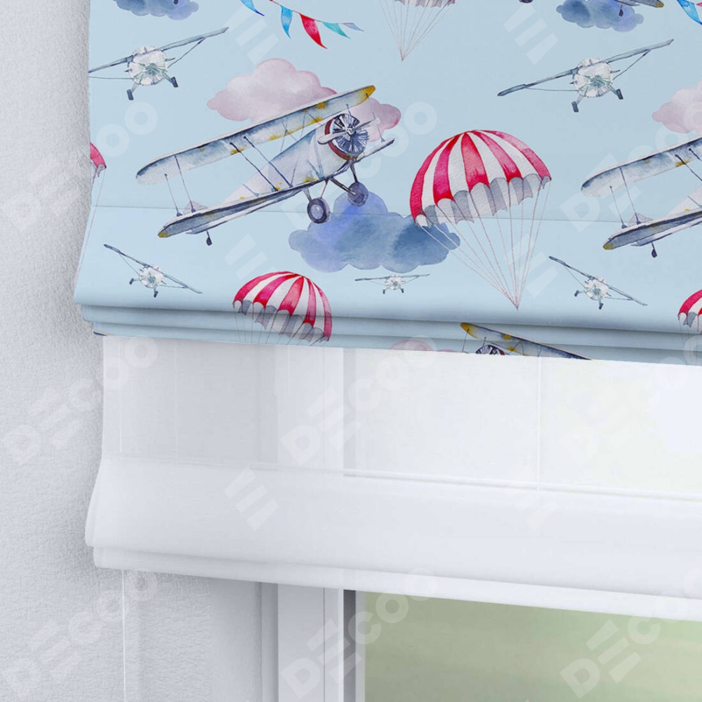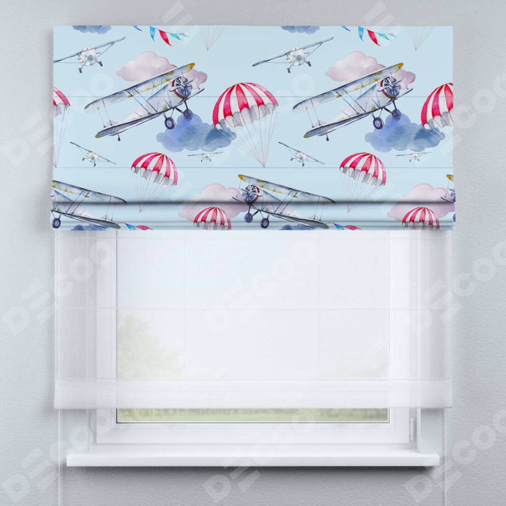 Римская штора день-ночь производителя «Cortin», используется для проёма, пошита из двух полотен, с лицевой блэкаут с нанесением сублимационной печати «Самолёт», вторая ткань тюль (по стандарту комплектуется тюль белого цвета артикул V-01). Имеет универсальный механизм и подходит для монтажа: на потолок, на стену и в нишу.