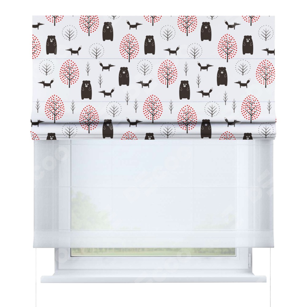 Римская штора день-ночь производителя «Cortin», используется для проёма, пошита из двух полотен, с лицевой блэкаут с нанесением сублимационной печати «Сканди лес», вторая ткань тюль (по стандарту комплектуется тюль белого цвета артикул V-01). Имеет универсальный механизм и подходит для монтажа: на потолок, на стену и в нишу.