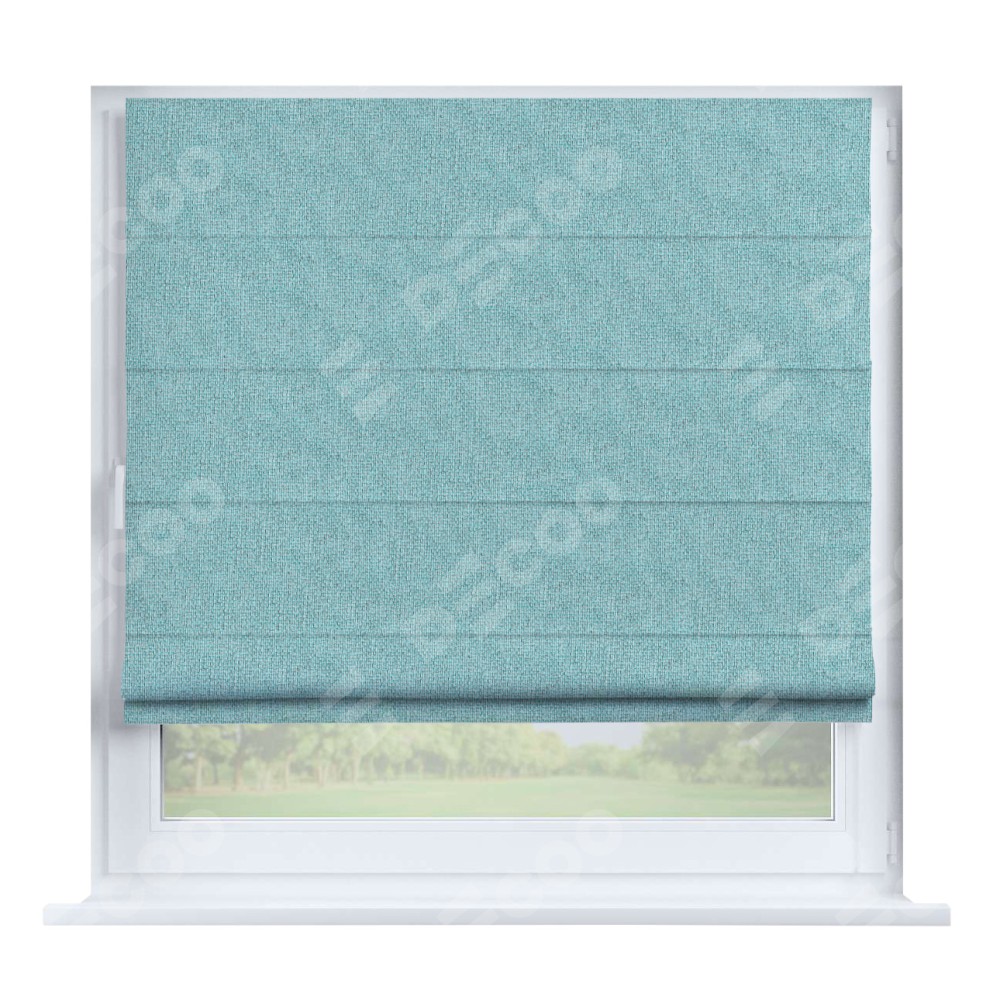 Римская штора производителя «Cortin», устанавливается на створку окна, пошита из ткани лён димаут бирюзовый, артикул 23. Штора шьётся по индивидуальным размерам, для данного типа римской шторы возможная ширина от 35 до 150 см., высота до 250 см.