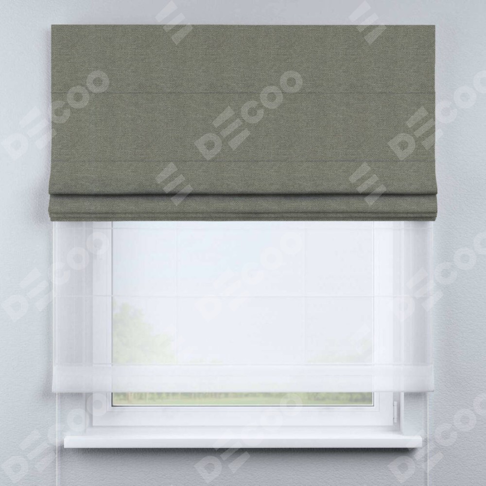 Римская штора день-ночь производителя «Cortin», используется для проёма, пошита из двух полотен, с лицевой стороны лён димаут стальной артикул 25, вторая ткань тюль (по стандарту комплектуется тюль белого цвета артикул V-01). Имеет универсальный механизм и подходит для монтажа: на потолок, на стену и в нишу.