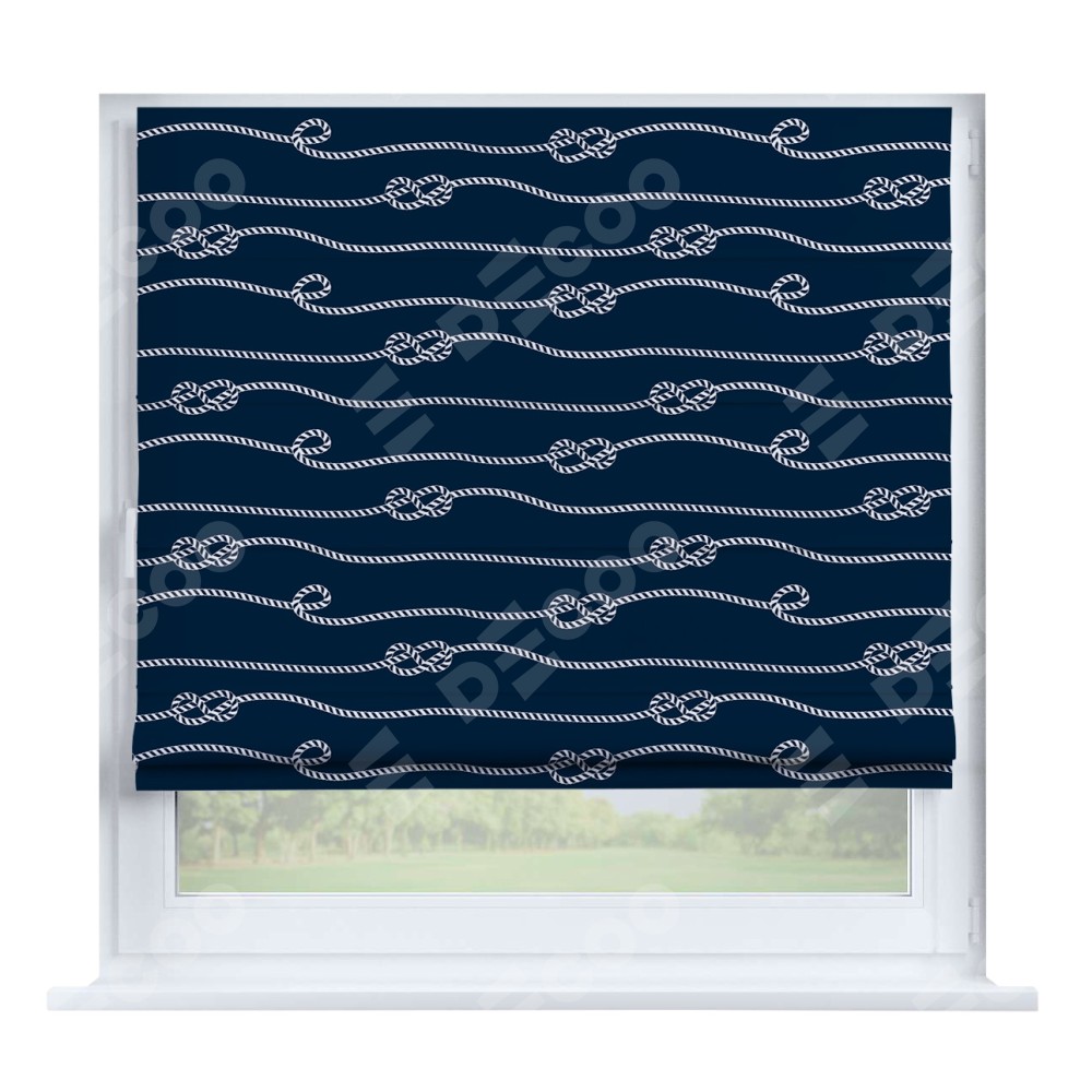 Римская штора производителя «Cortin», устанавливается на створку окна, пошита из ткани блэкаут с нанесением сублимационной печати «Морской узел». Штора шьётся по индивидуальным размерам, для данного типа римской шторы возможная ширина от 35 до 150 см., высота до 250 см.