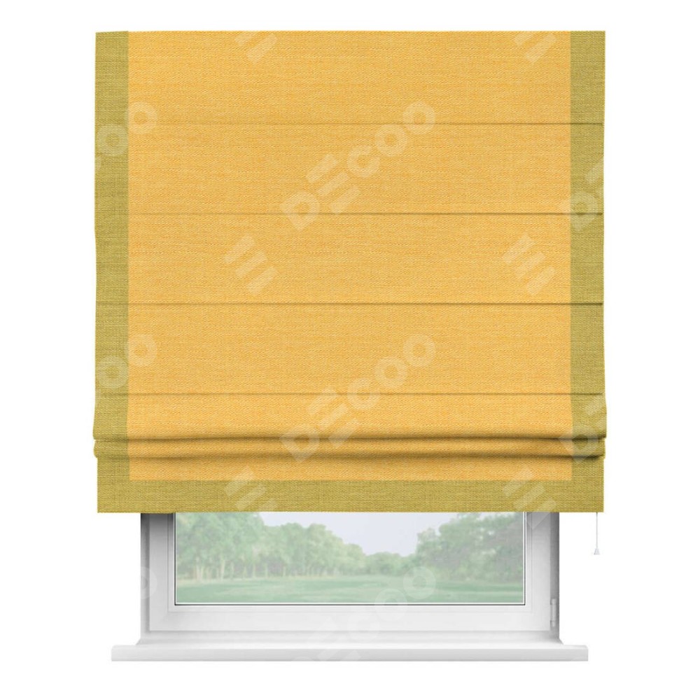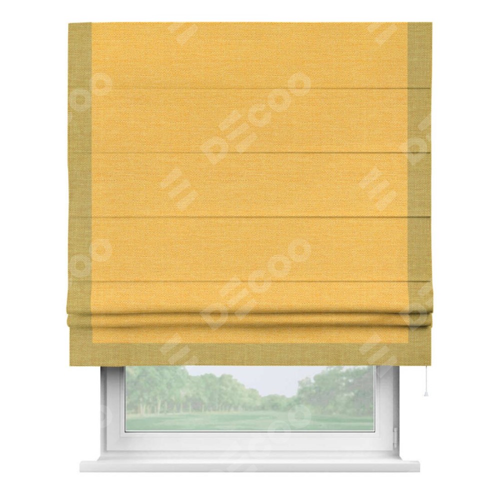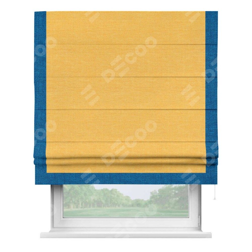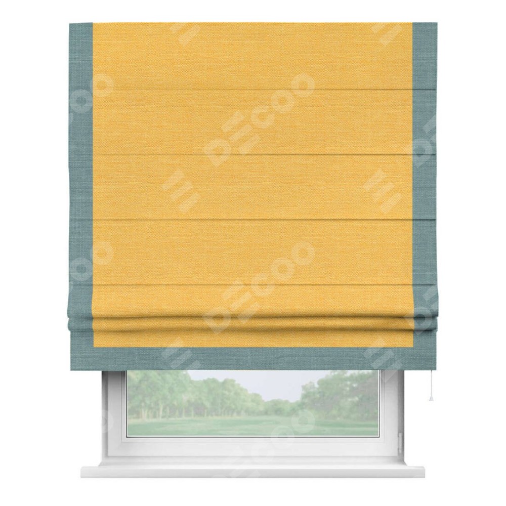 Римская штора производителя «Cortin», используется для проёма, пошита из ткани лён желтый, артикул 63738. Отделка шторы кантом «Виктория», ткань для канта используется из льна разной расцветки на выбор. Имеет универсальный механизм и подходит для монтажа: на потолок, на стену и в нишу.