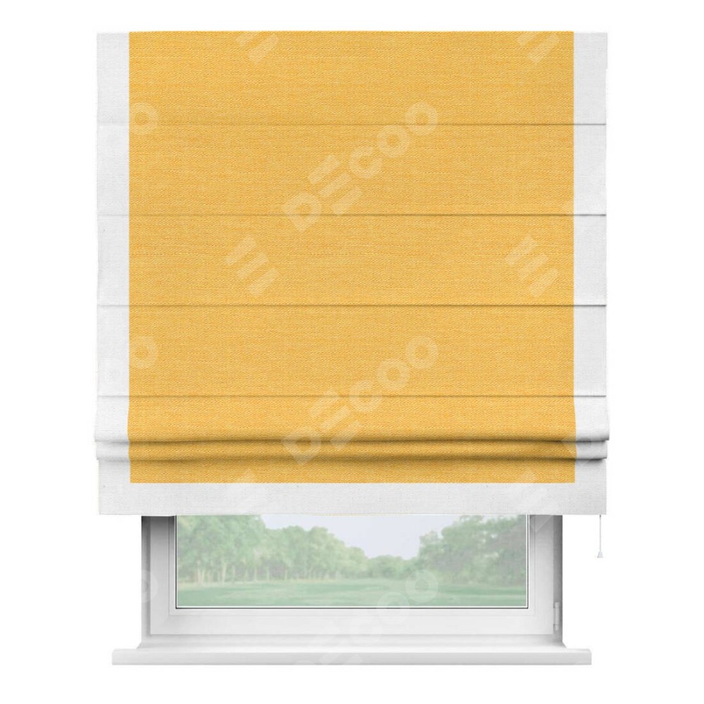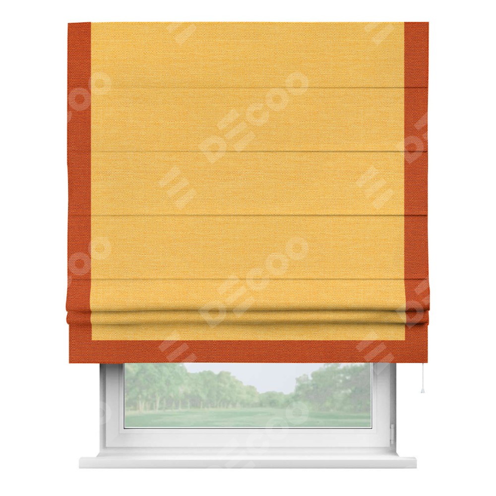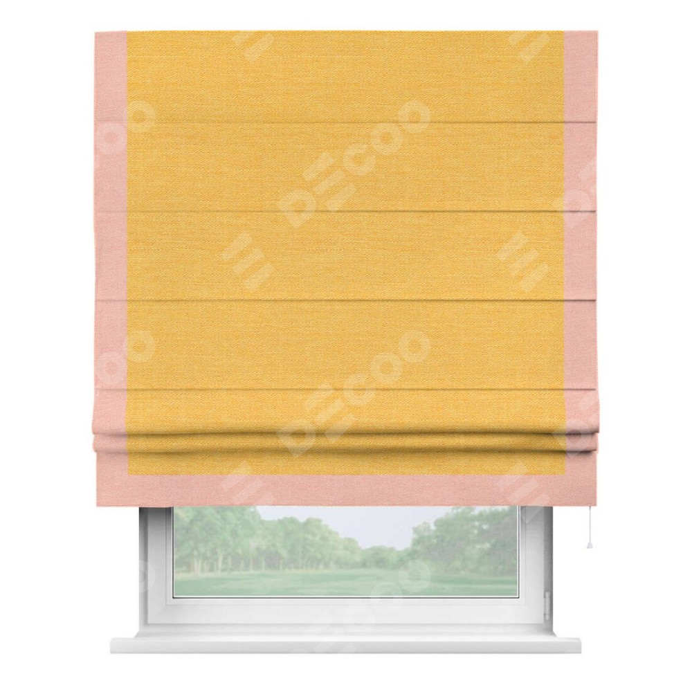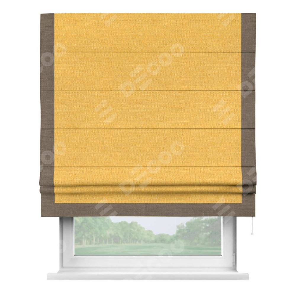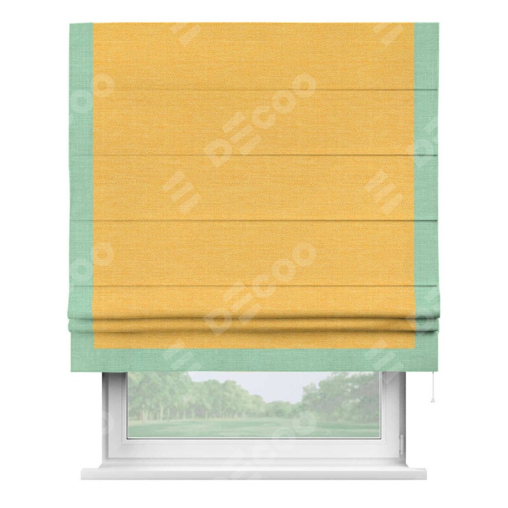 Римская штора производителя «Cortin», используется для проёма, пошита из ткани лён желтый, артикул 63738. Отделка шторы кантом «Виктория», ткань для канта используется из льна разной расцветки на выбор. Имеет универсальный механизм и подходит для монтажа: на потолок, на стену и в нишу.