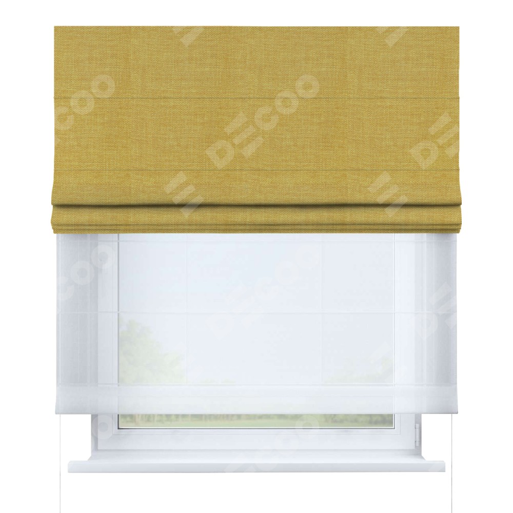 Римская штора день-ночь производителя «Cortin», используется для проёма, пошита из двух полотен, с лицевой стороны лён горчичный артикул 74740, вторая ткань тюль (по стандарту комплектуется тюль белого цвета артикул V-01). Имеет универсальный механизм и подходит для монтажа: на потолок, на стену и в нишу.