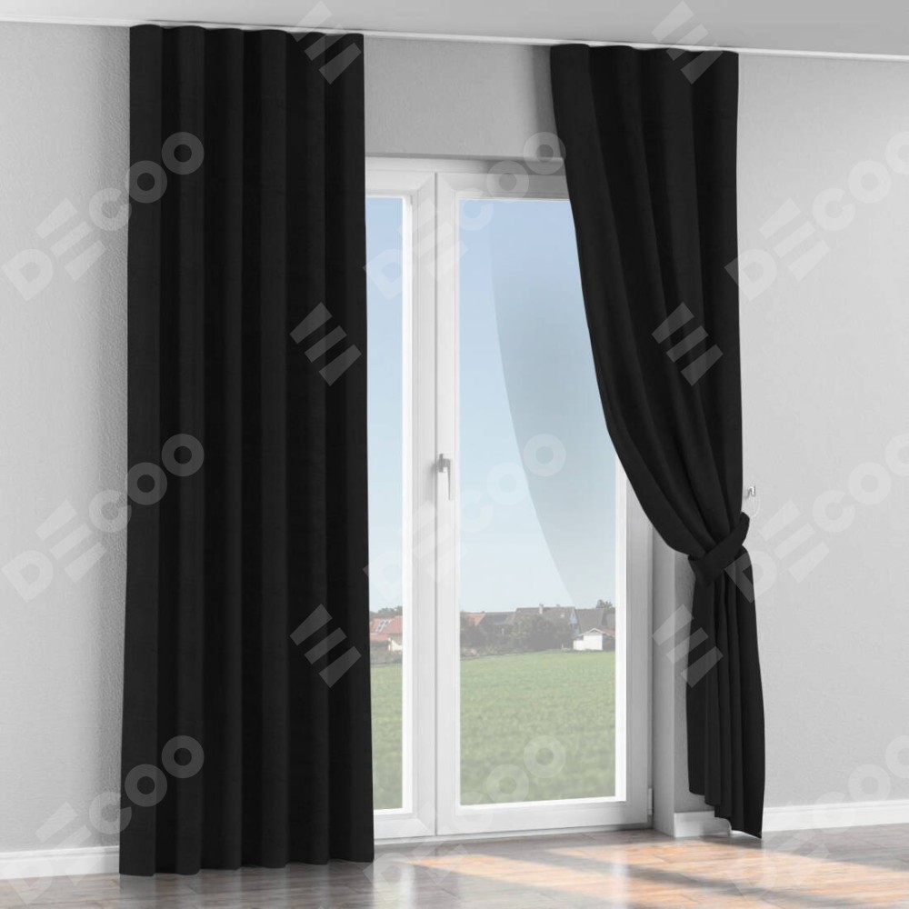 Комплект прямых штор, от производителя «Cortin», пошиты из ткани блэкаут однотонный черный, артикул ткани 79904. С изнаночной стороны в верхней части штор пристрачивается шторная лента с декоративными складками «Волна». Для создания элегантных складок прямые шторы шьются по стандарту с коэффициентом 1:2 (на 100 см. ширины проёма 200 см. ширины ткани).