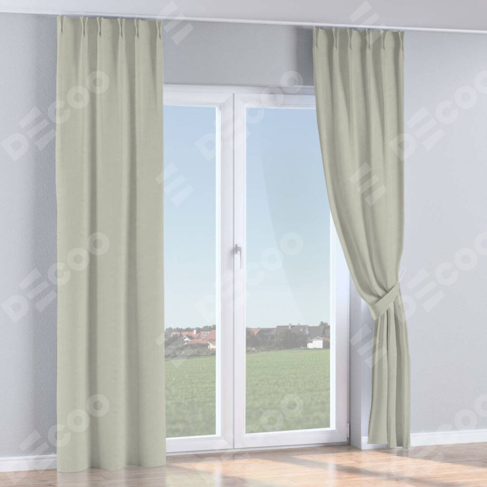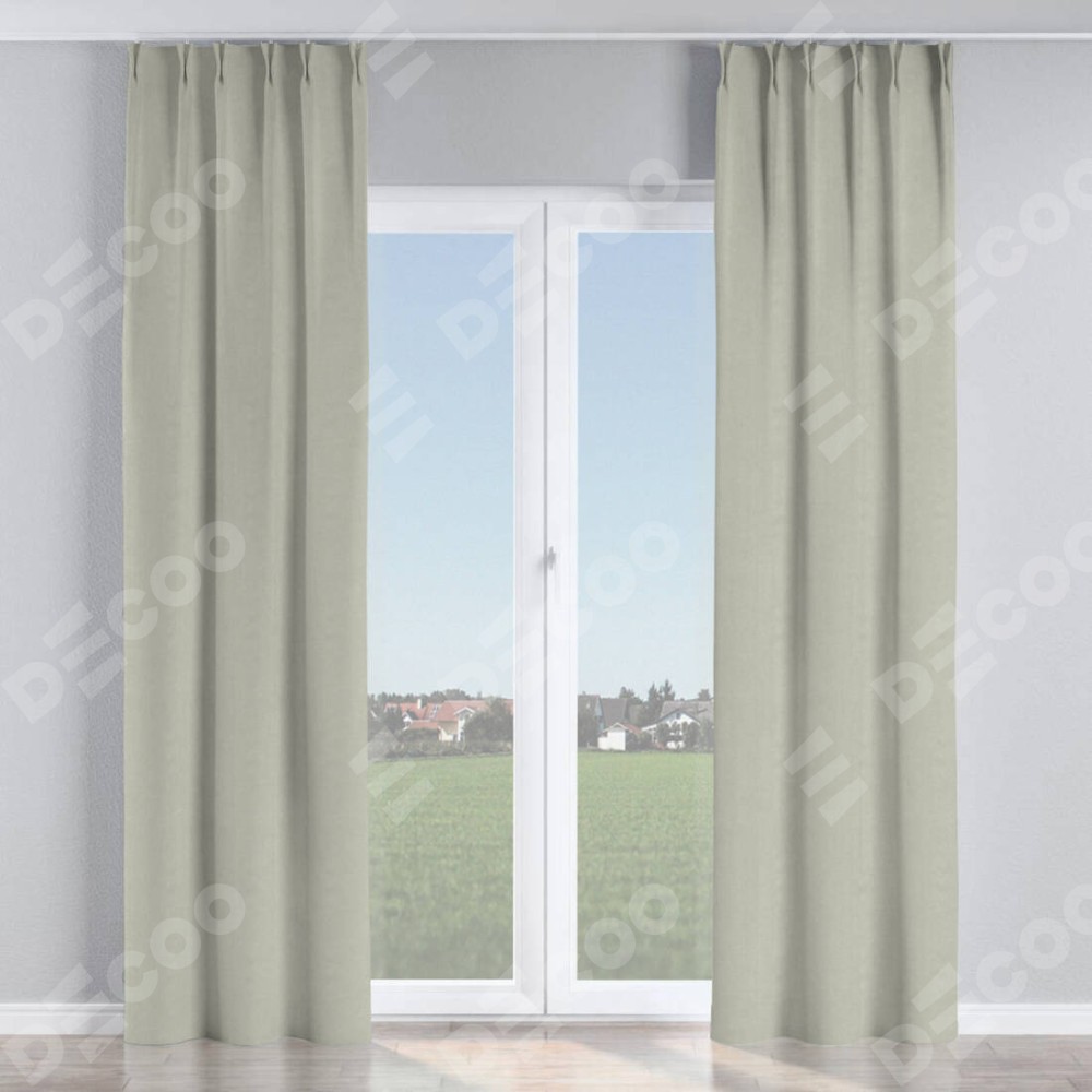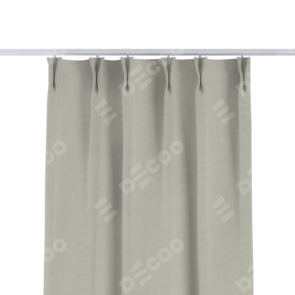 Комплект прямых штор, от производителя «Cortin», пошиты из ткани лён димаут светло-серый, артикул ткани 83025. С изнаночной стороны в верхней части штор пристрачивается шторная лента с декоративными складками «Кустик». Для создания элегантных складок прямые шторы шьются по стандарту с коэффициентом 1:2 (на 100 см. ширины проёма 200 см. ширины ткани).
