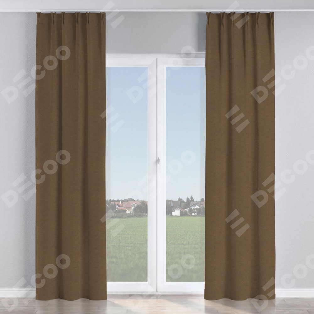 Комплект прямых штор, от производителя «Cortin», пошиты из ткани лён димаут тёмно-коричневый, артикул ткани 83030. С изнаночной стороны в верхней части штор пристрачивается шторная лента с декоративными складками «Кустик». Для создания элегантных складок прямые шторы шьются по стандарту с коэффициентом 1:2 (на 100 см. ширины проёма 200 см. ширины ткани).