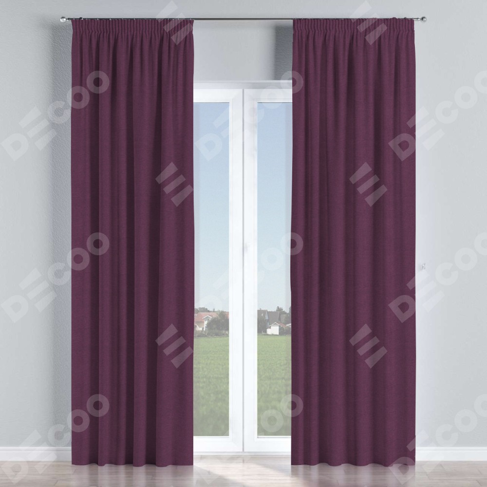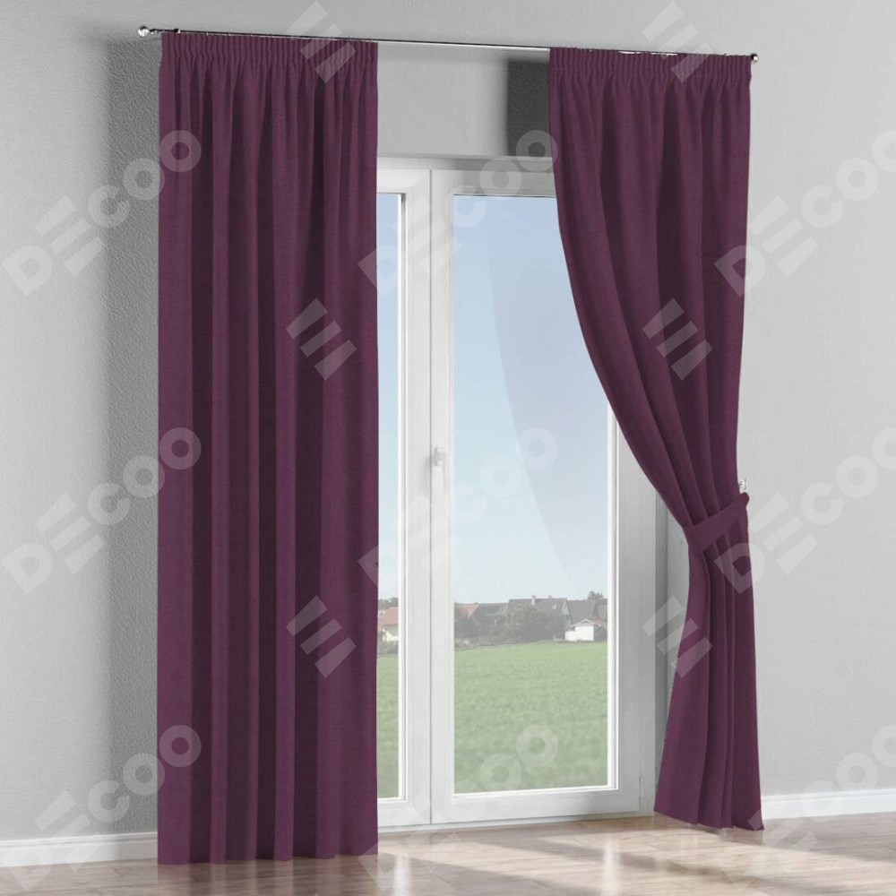 Комплект прямых штор, от производителя «Cortin», пошиты из ткани лён димаут фиолетовый, артикул ткани 8817. С изнаночной стороны в верхней части штор пристрачивается шторная лента с декоративными складками «Карандаш». Для создания элегантных складок прямые шторы шьются по стандарту с коэффициентом 1:2 (на 100 см. ширины проёма 200 см. ширины ткани).