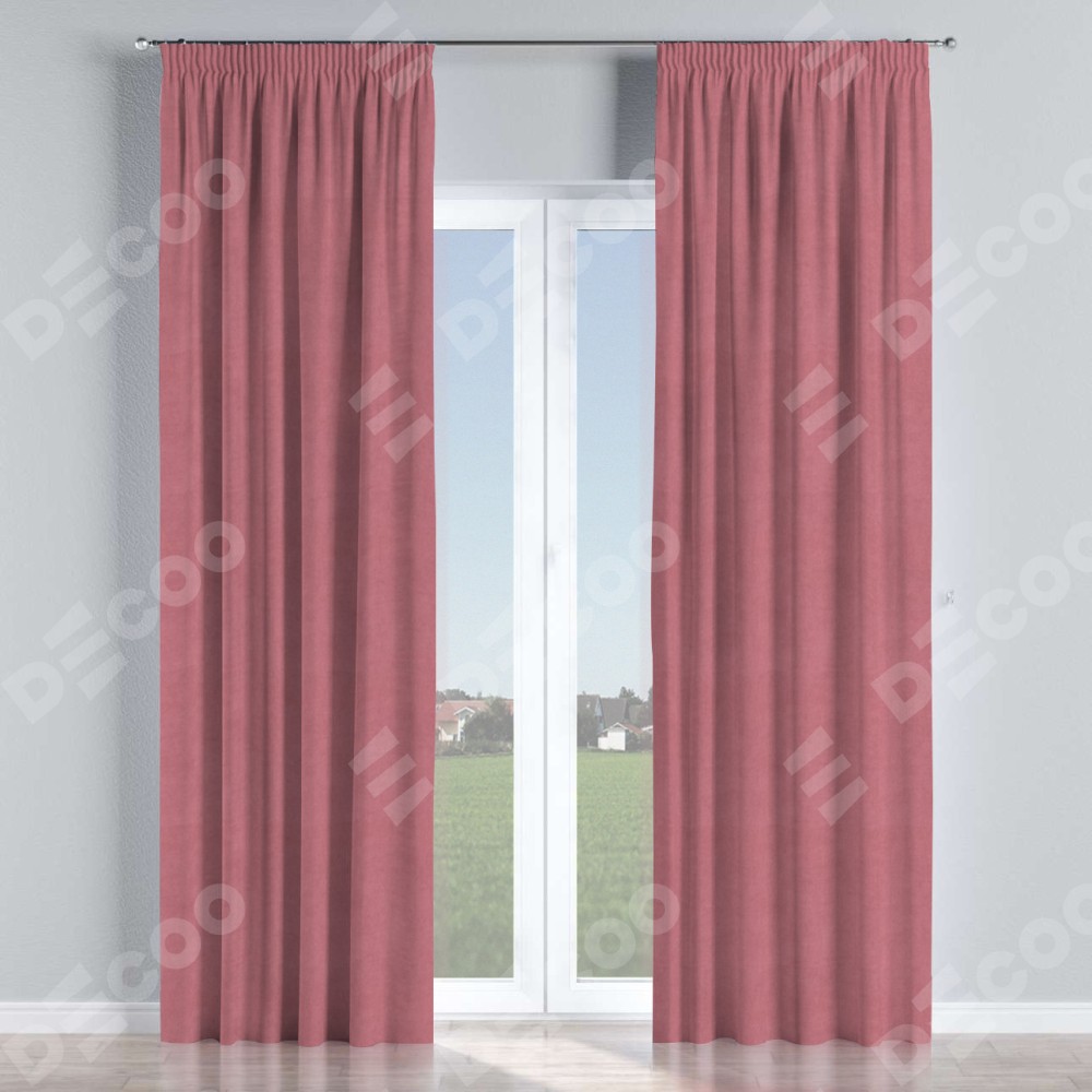Комплект прямых штор, от производителя «Cortin», пошиты из ткани вельвет брусника, артикул ткани 85550. С изнаночной стороны в верхней части штор пристрачивается шторная лента с декоративными складками «Карандаш». Для создания элегантных складок прямые шторы шьются по стандарту с коэффициентом 1:2 (на 100 см. ширины проёма 200 см. ширины ткани).