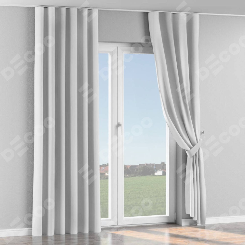 Комплект прямых штор, от производителя «Cortin», пошиты из ткани лён белый, артикул ткани 53430. С изнаночной стороны в верхней части штор пристрачивается шторная лента с декоративными складками «Волна». Для создания элегантных складок прямые шторы шьются по стандарту с коэффициентом 1:2 (на 100 см. ширины проёма 200 см. ширины ткани).