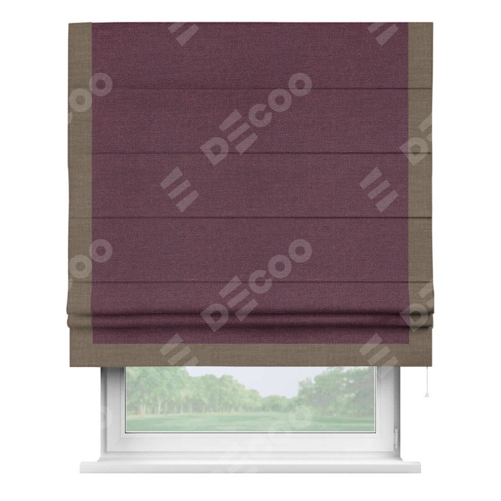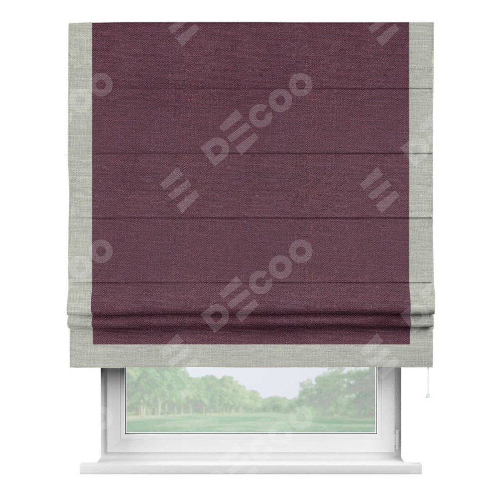 Римская штора производителя «Cortin», используется для проёма, пошита из ткани лён фиолетовый, артикул 85907. Отделка шторы кантом «Виктория», ткань для канта используется из льна разной расцветки на выбор. Имеет универсальный механизм и подходит для монтажа: на потолок, на стену и в нишу.