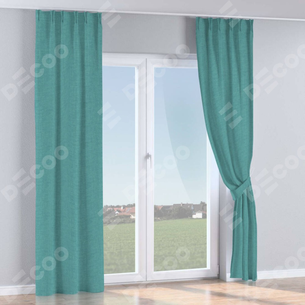 Комплект прямых штор, от производителя «Cortin», пошиты из ткани лён бирюза, артикул ткани 7446. С изнаночной стороны в верхней части штор пристрачивается шторная лента с декоративными складками «Кустик». Для создания элегантных складок прямые шторы шьются по стандарту с коэффициентом 1:2 (на 100 см. ширины проёма 200 см. ширины ткани).