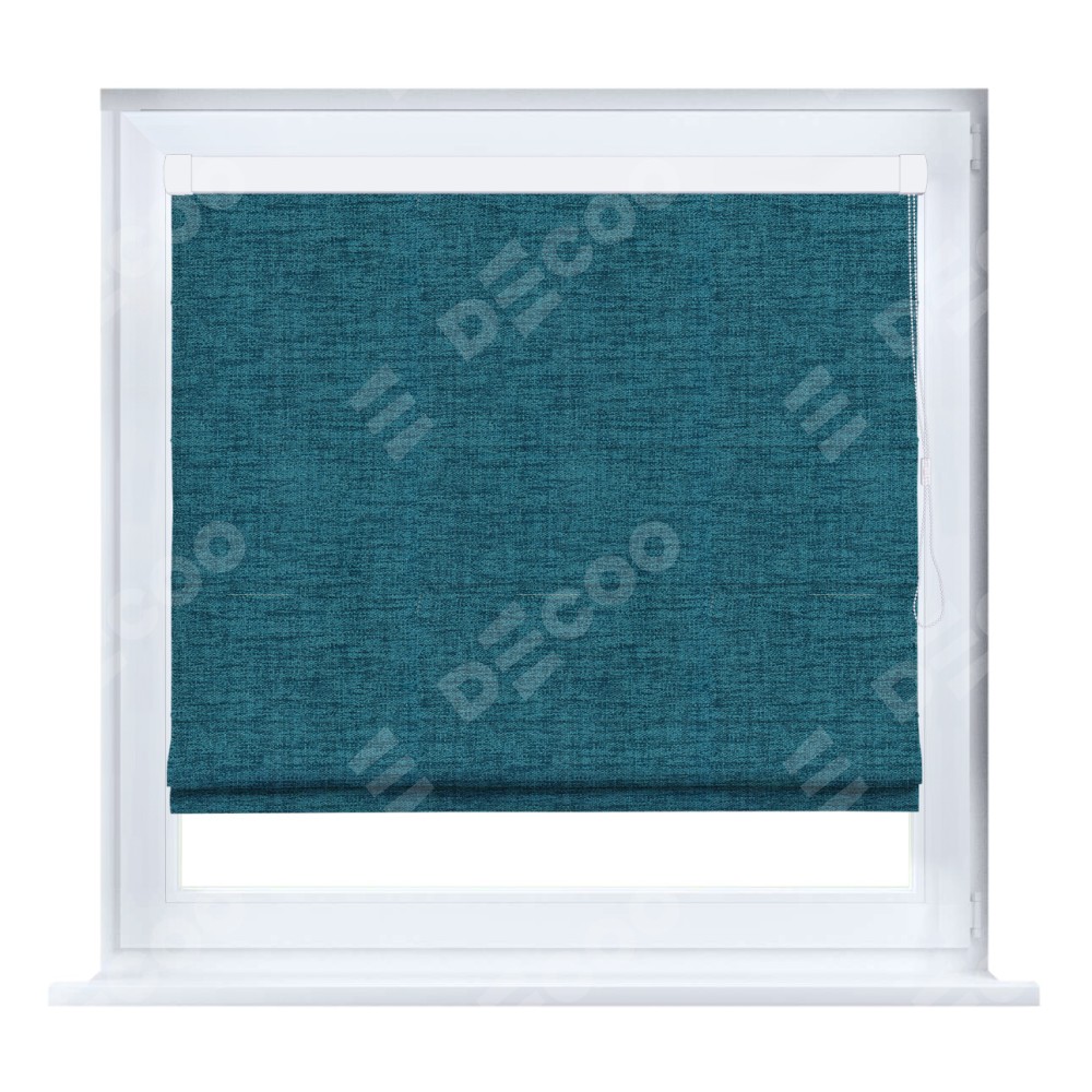 Римская штора кассетного типа, производителя «Cortin», устанавливается только на пластиковые окна и прилегает к стеклопакету, пошита из ткани рогожка димаут синий, артикул 80422.