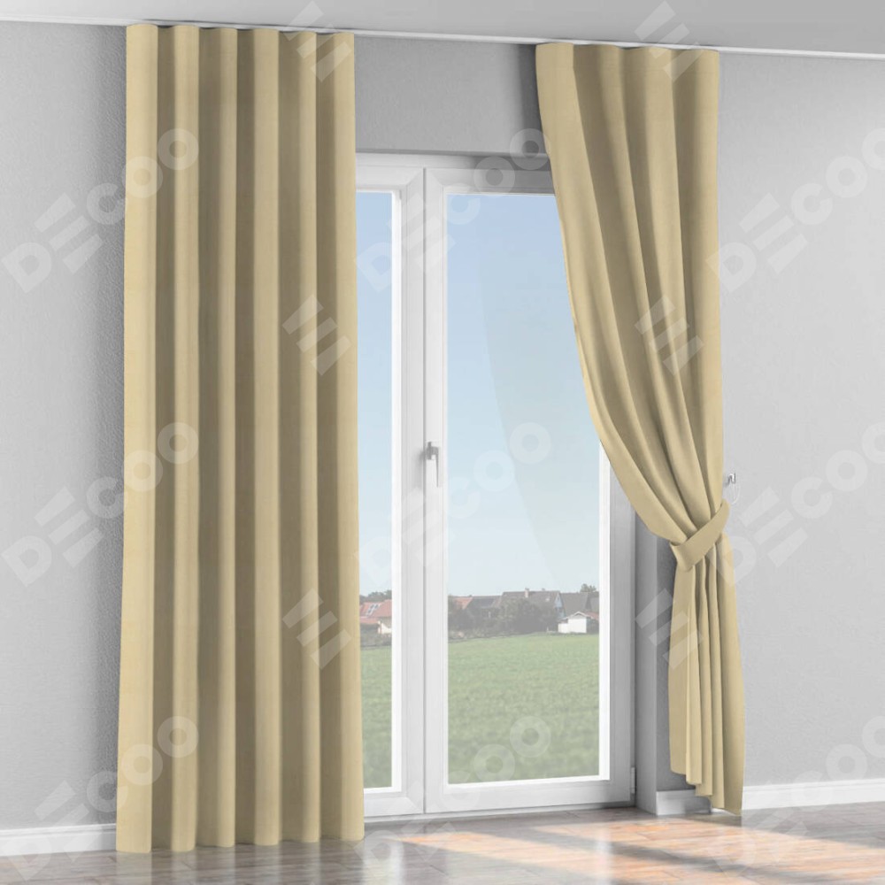 Комплект прямых штор, от производителя «Cortin», пошиты из ткани блэкаут однотонный милано латте, артикул ткани 05. С изнаночной стороны в верхней части штор пристрачивается шторная лента с декоративными складками «Волна». Для создания элегантных складок прямые шторы шьются по стандарту с коэффициентом 1:2 (на 100 см. ширины проёма 200 см. ширины ткани).