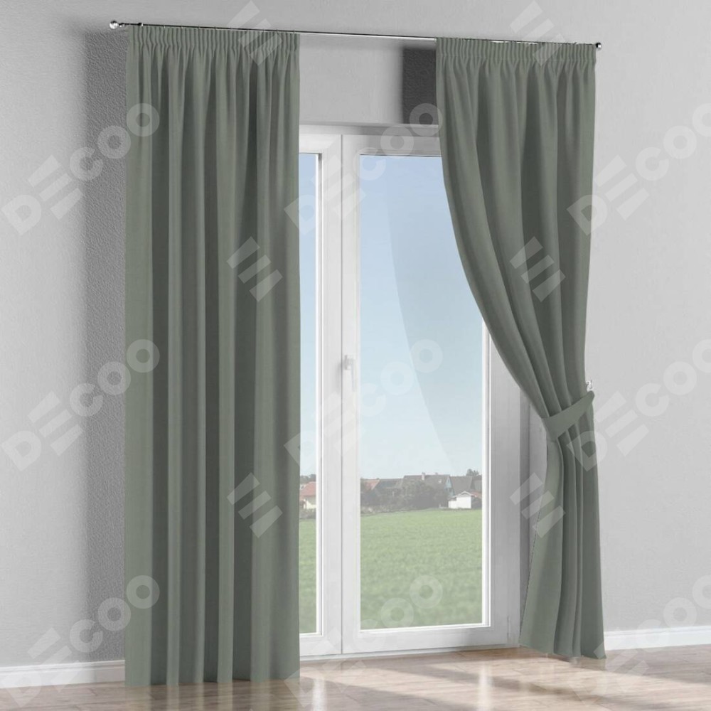 Комплект прямых штор, от производителя «Cortin», пошиты из ткани блэкаут однотонный тёмно-серый, артикул ткани 18077. С изнаночной стороны в верхней части штор пристрачивается шторная лента с декоративными складками «Карандаш». Для создания элегантных складок прямые шторы шьются по стандарту с коэффициентом 1:2 (на 100 см. ширины проёма 200 см. ширины ткани).