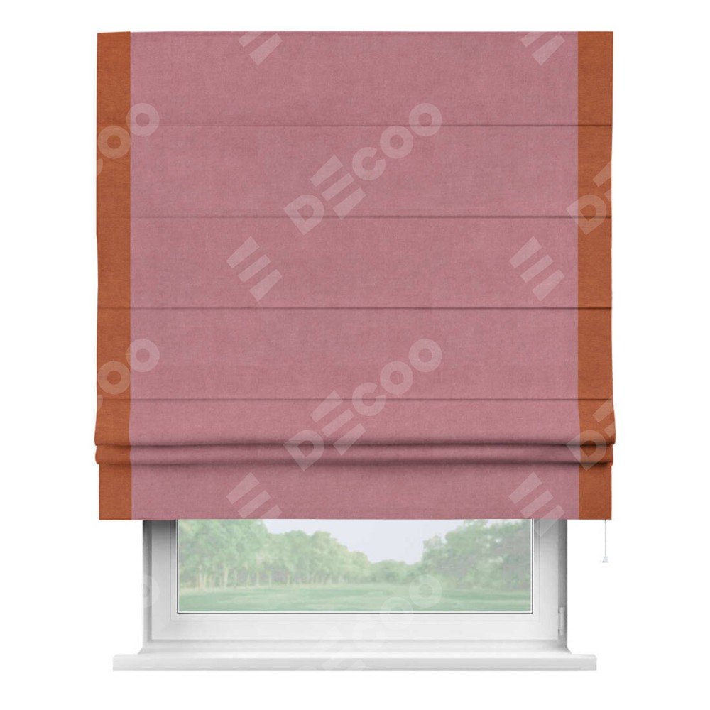 Римская штора производителя «Cortin», используется для проёма, пошита из ткани вельвет брусника, артикул ткани 85550. Отделка шторы кантом «Стрим Дуо», ткань для канта используется из вельвета разной расцветки на выбор. Имеет универсальный механизм и подходит для монтажа: на потолок, на стену и в нишу.