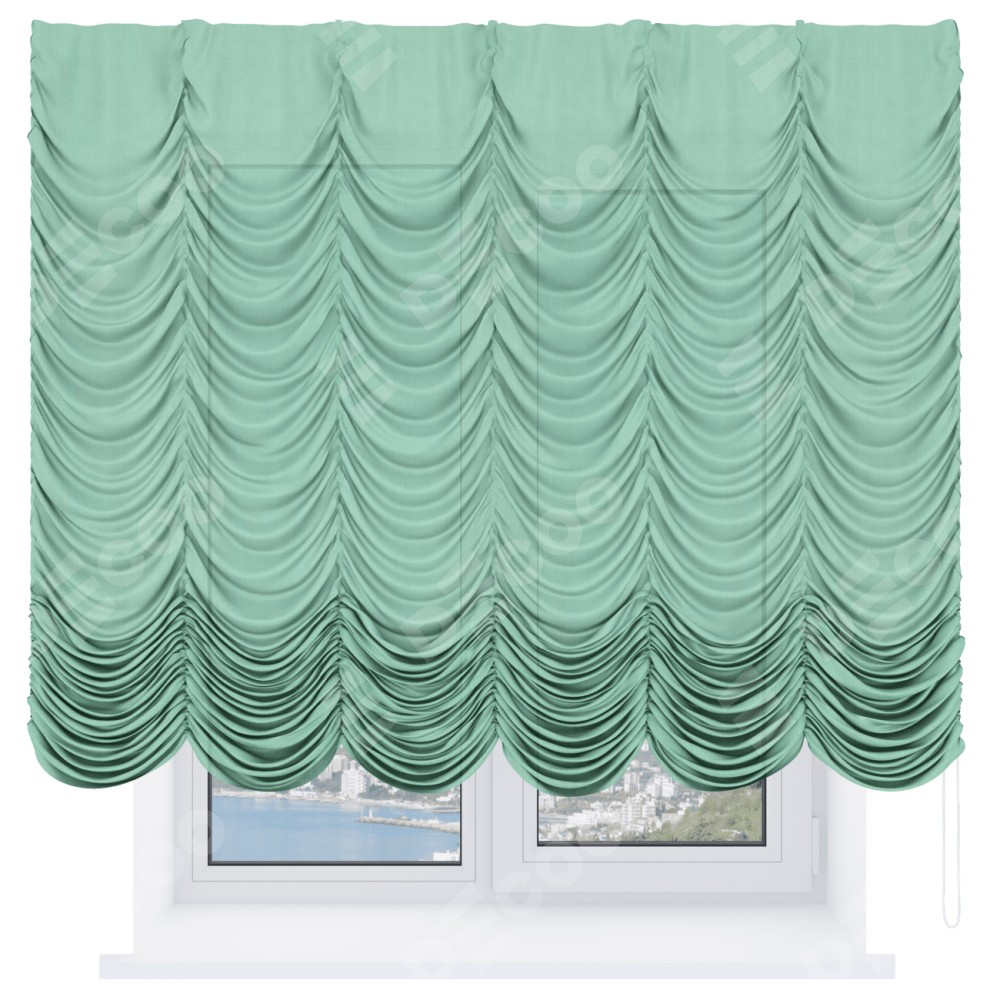 Французская штора производителя «Cortin», используется для проёма, пошита из ткани лён светло-бирюзовый, артикул ткани 74737. Имеет универсальный механизм и подходит для монтажа: на потолок и на стену.