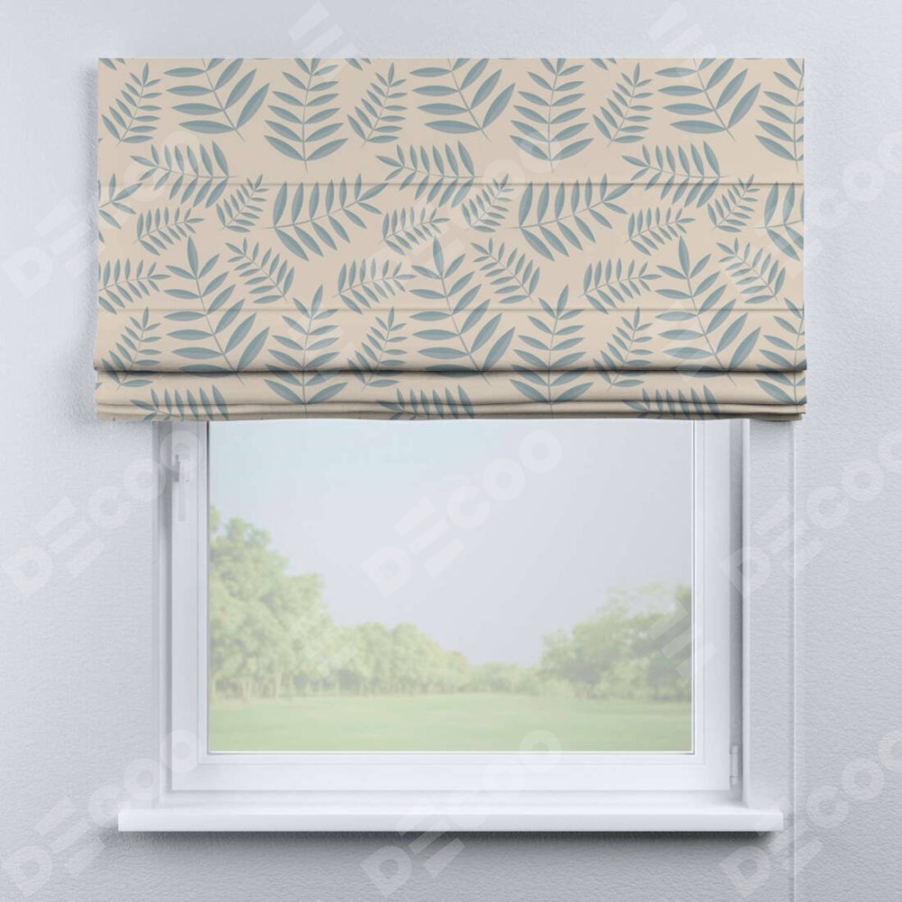 Римская штора производителя «Cortin», используется для проёма, пошита из ткани блэкаут с нанесением сублимационной печати «Веточка с листочками». Имеет универсальный механизм и подходит для монтажа: на потолок, на стену и в нишу.