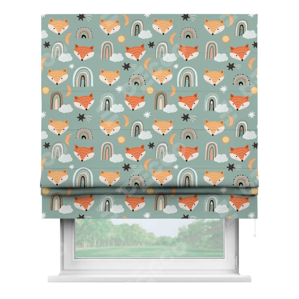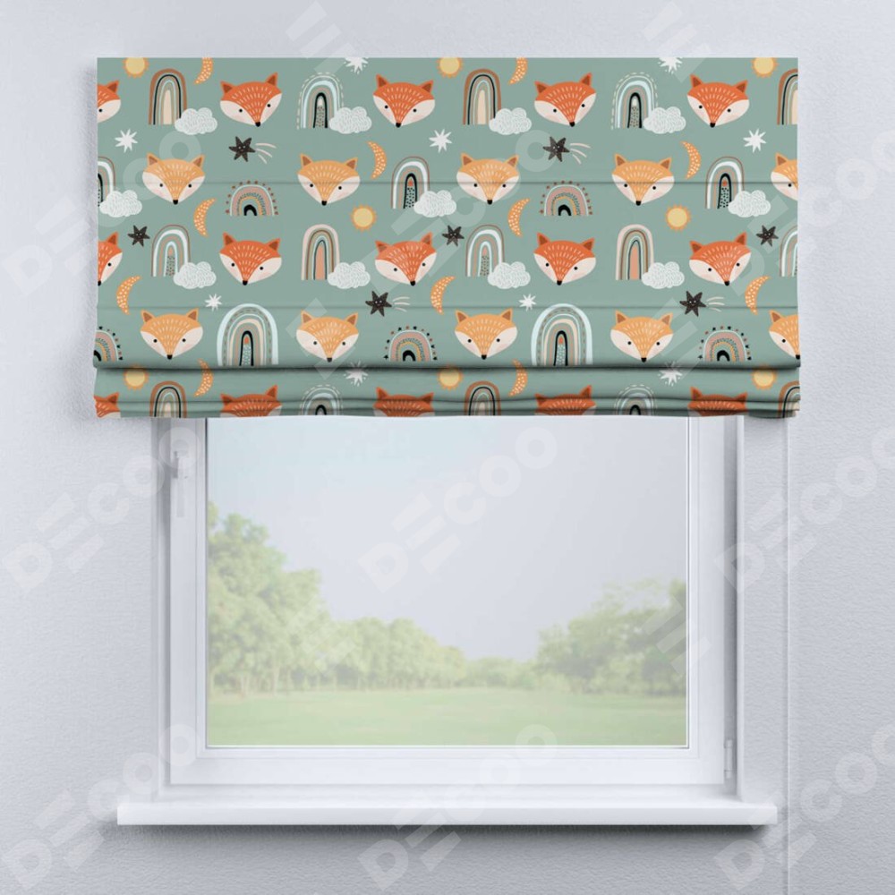 Римская штора производителя «Cortin», используется для проёма, пошита из ткани блэкаут с нанесением сублимационной печати «Озорные лисички». Имеет универсальный механизм и подходит для монтажа: на потолок, на стену и в нишу.