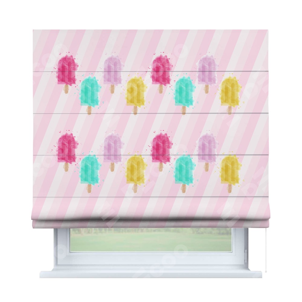 Римская штора производителя «Cortin», используется для проёма, пошита из ткани блэкаут с нанесением сублимационной печати «Фруктовое мороженое». Имеет универсальный механизм и подходит для монтажа: на потолок, на стену и в нишу.