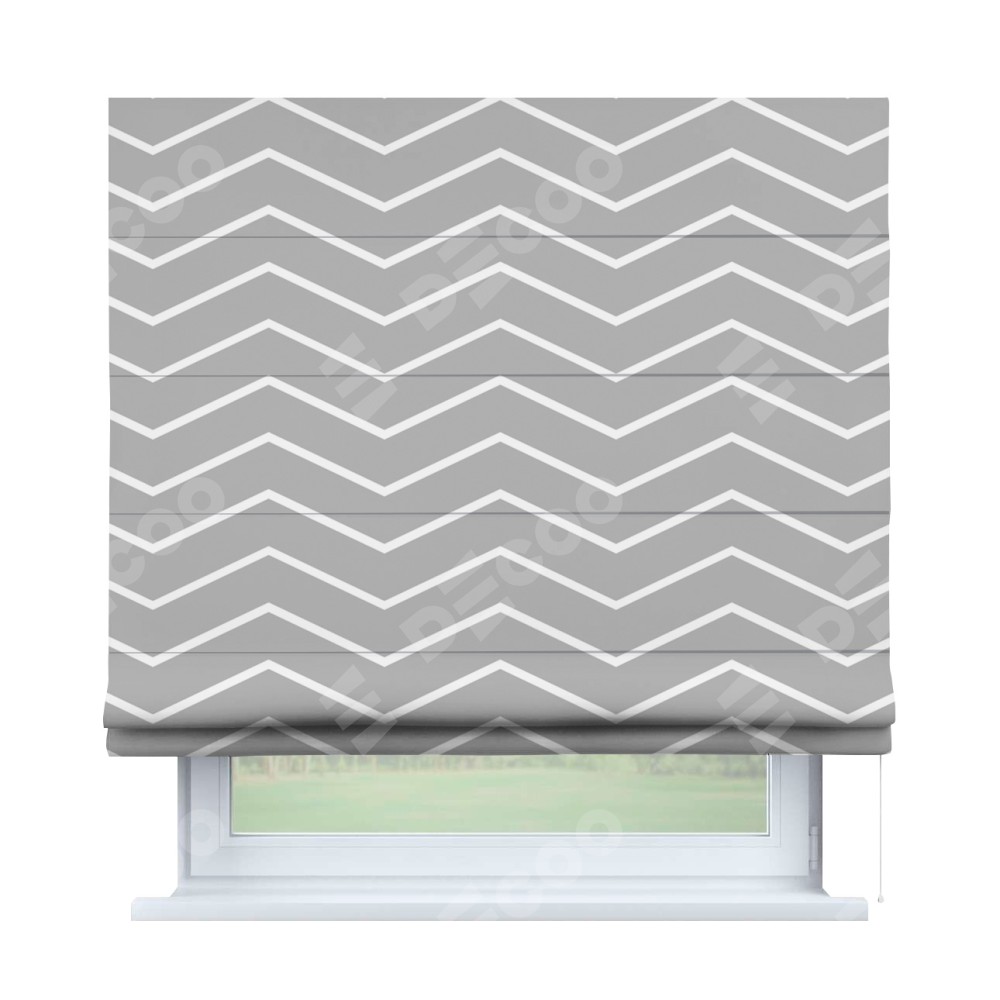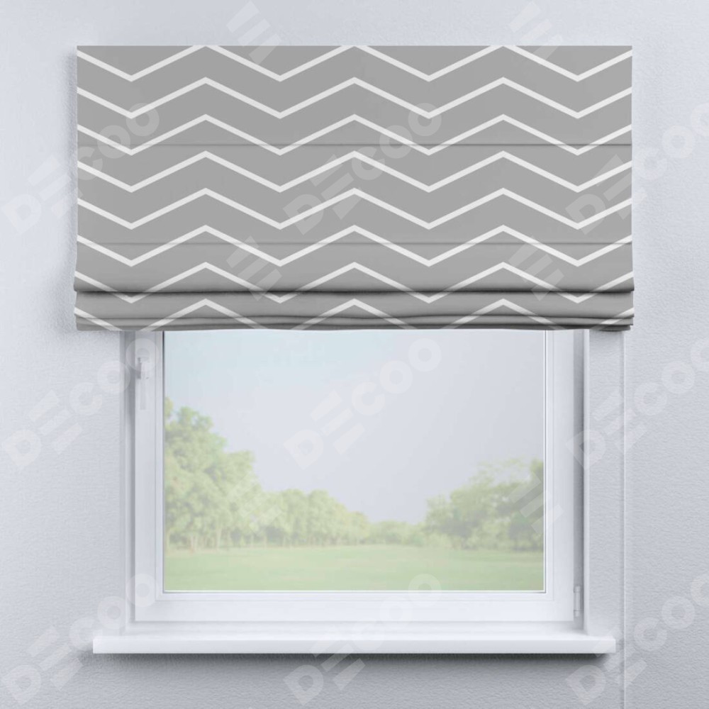 Римская штора производителя «Cortin», используется для проёма, пошита из ткани блэкаут с нанесением сублимационной печати «Серый зигзаг». Имеет универсальный механизм и подходит для монтажа: на потолок, на стену и в нишу.