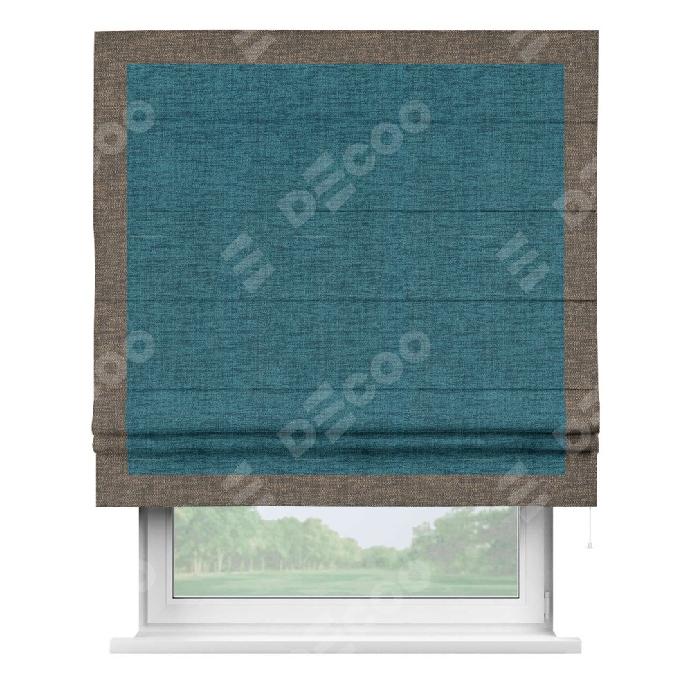 Римская штора производителя «Cortin», используется для проёма, пошита из ткани рогожка димаут синий, артикул 80422. Отделка шторы кантом «Чесс», ткань для канта используется из рогожки димаут разной расцветки на выбор. Имеет универсальный механизм и подходит для монтажа: на потолок, на стену и в нишу.