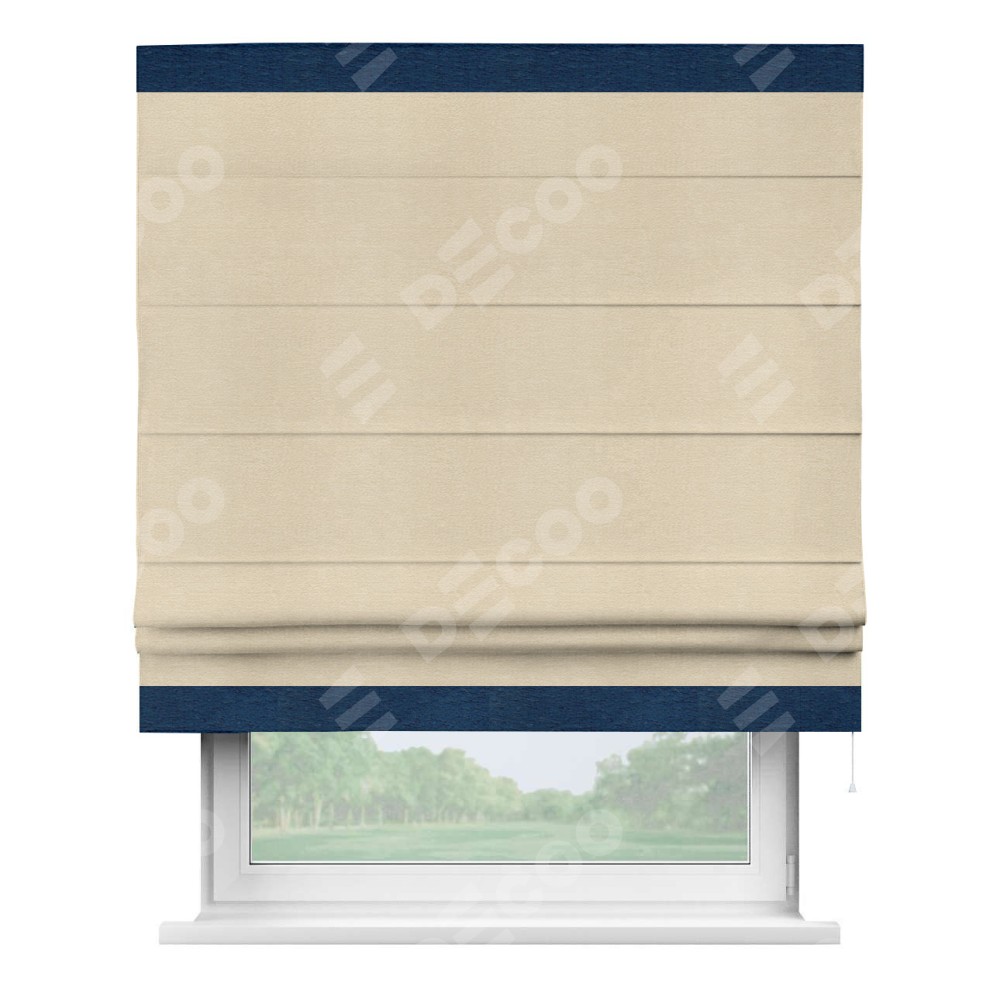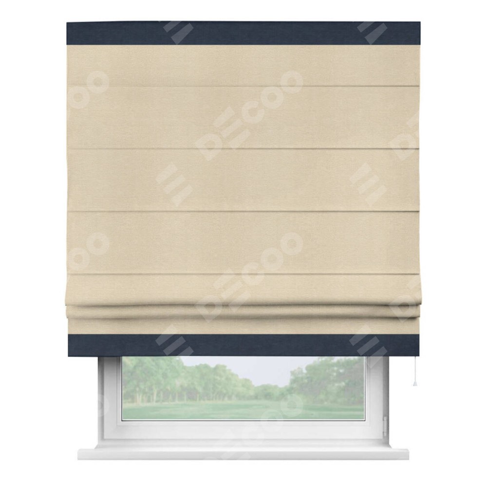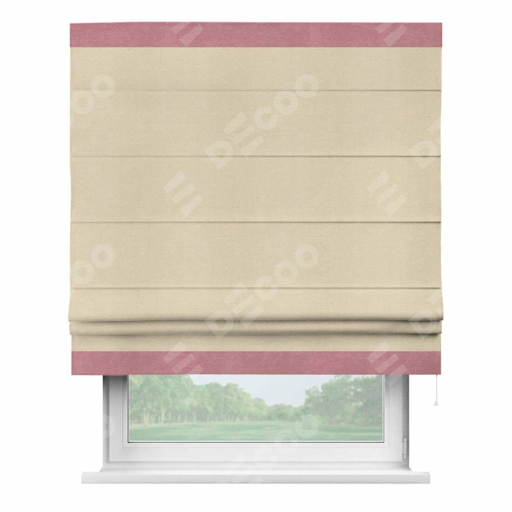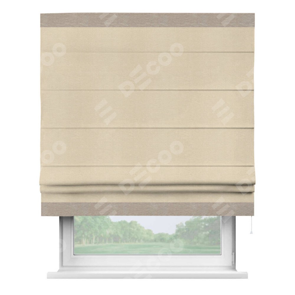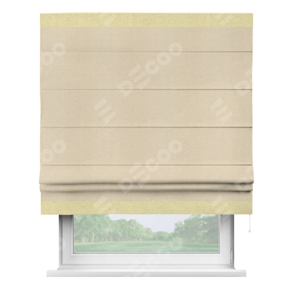 Римская штора производителя «Cortin», используется для проёма, пошита из ткани софт однотонный бежевый лайт, артикул 33100. Отделка шторы кантом «Горизонт», ткань для канта используется из софта разной расцветки на выбор. Имеет универсальный механизм и подходит для монтажа: на потолок, на стену и в нишу.