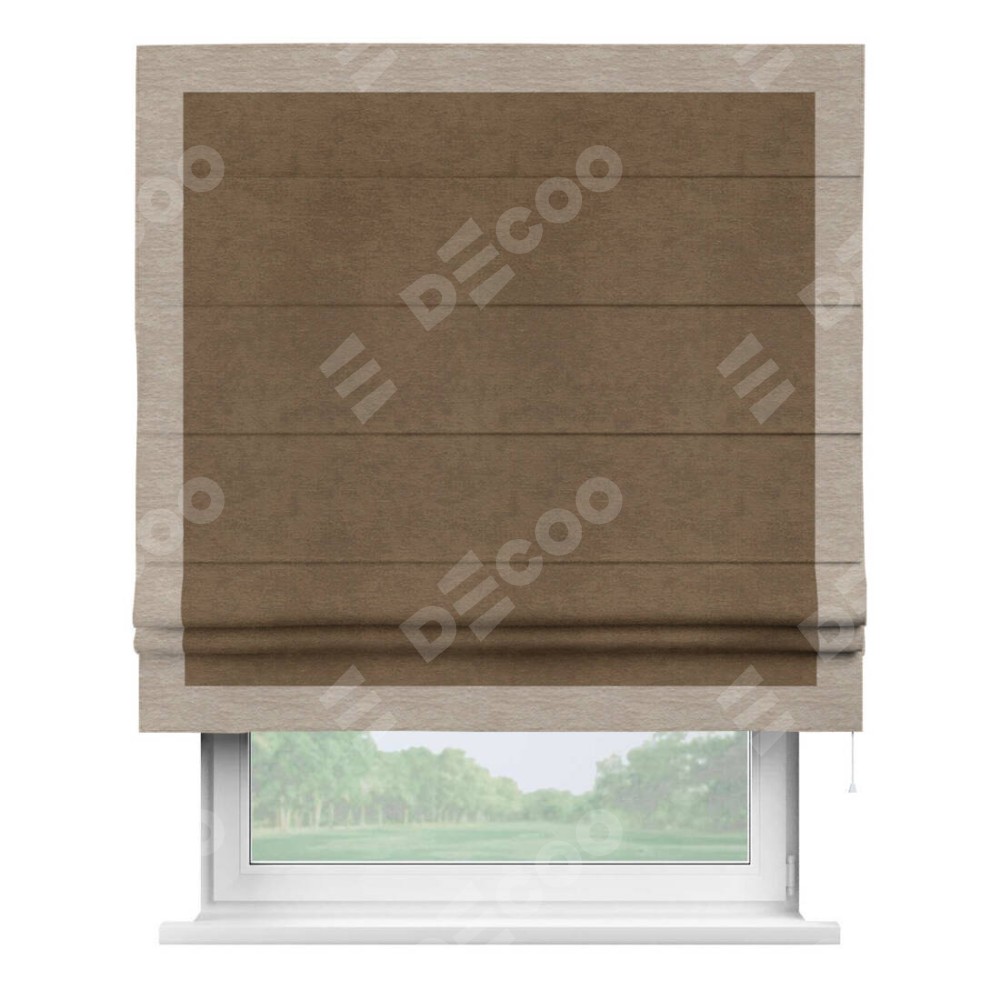 Римская штора производителя «Cortin», используется для проёма, пошита из ткани софт однотонный бронзовый, артикул 33099. Отделка шторы кантом «Чесс», ткань для канта используется из софта разной расцветки на выбор. Имеет универсальный механизм и подходит для монтажа: на потолок, на стену и в нишу.
