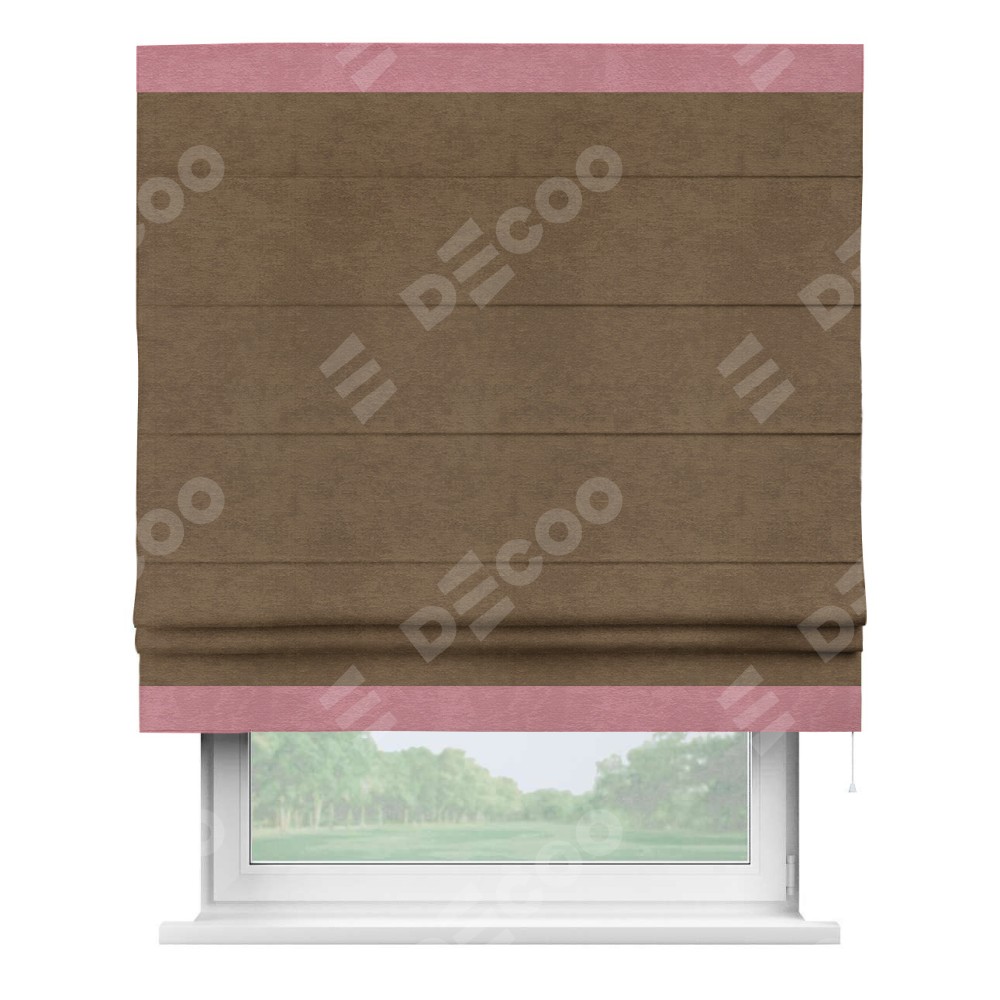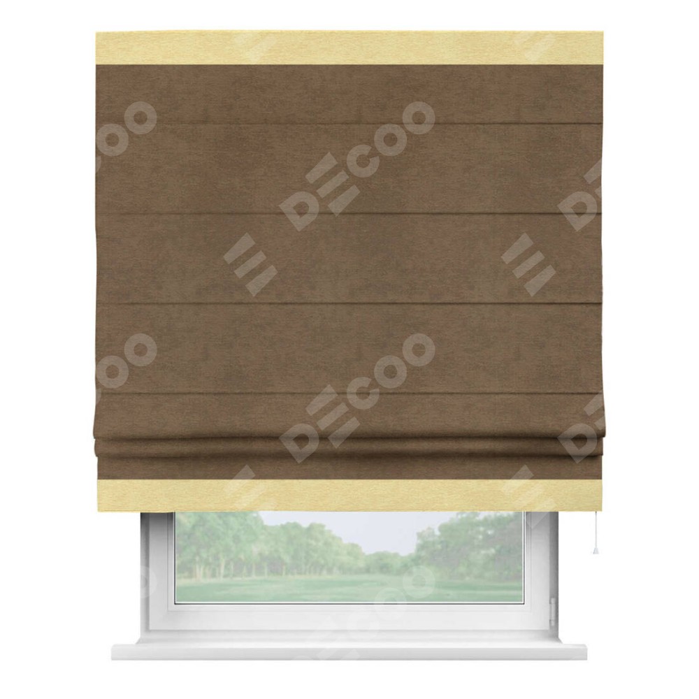 Римская штора производителя «Cortin», используется для проёма, пошита из ткани софт однотонный бронзовый, артикул 33099. Отделка шторы кантом «Горизонт», ткань для канта используется из софта разной расцветки на выбор. Имеет универсальный механизм и подходит для монтажа: на потолок, на стену и в нишу.