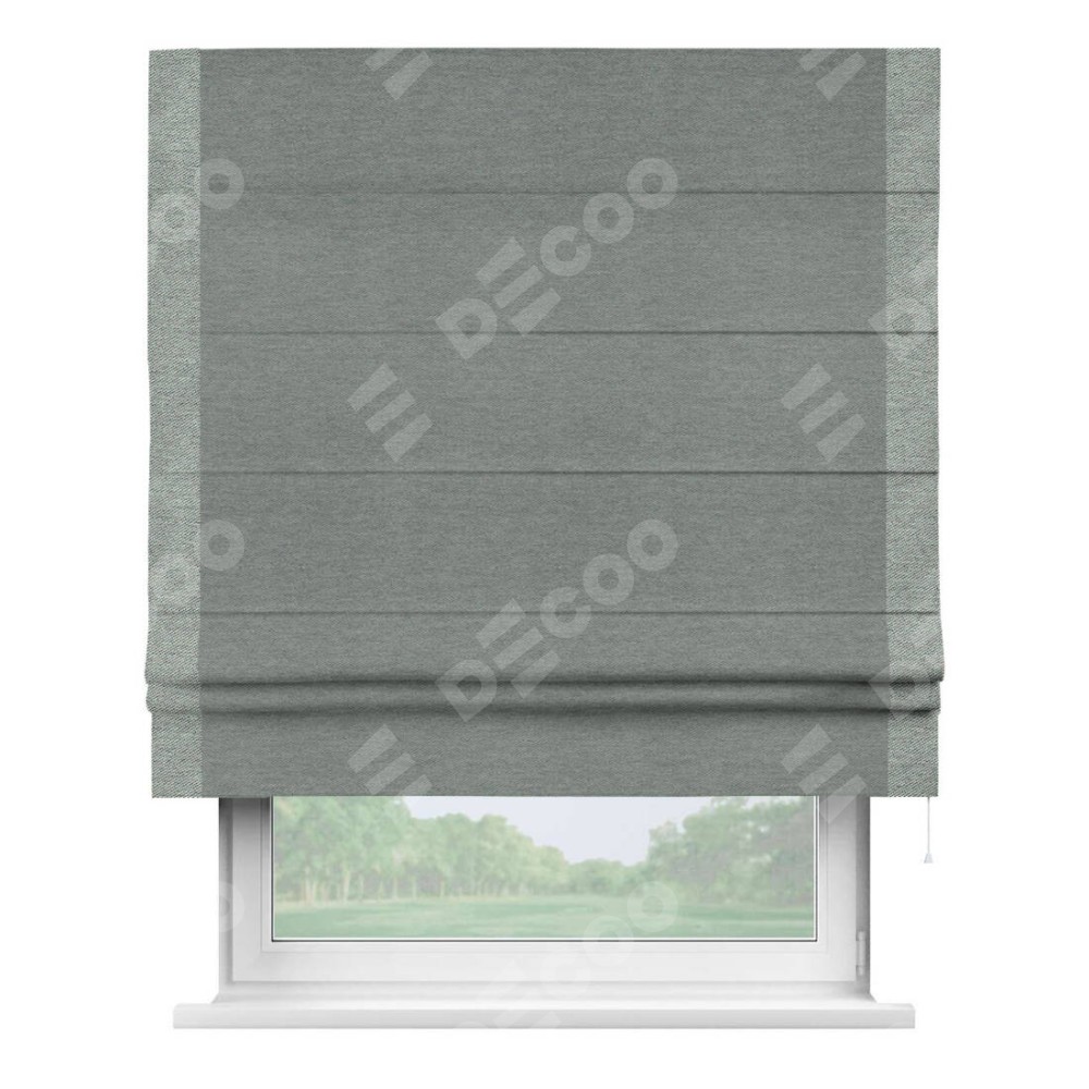 Римская штора производителя «Cortin», используется для проёма, пошита из ткани твид блэкаут серый, артикул 21577. Отделка шторы кантом «Стрим Дуо», ткань для канта используется из твида разной расцветки на выбор. Имеет универсальный механизм и подходит для монтажа: на потолок, на стену и в нишу.