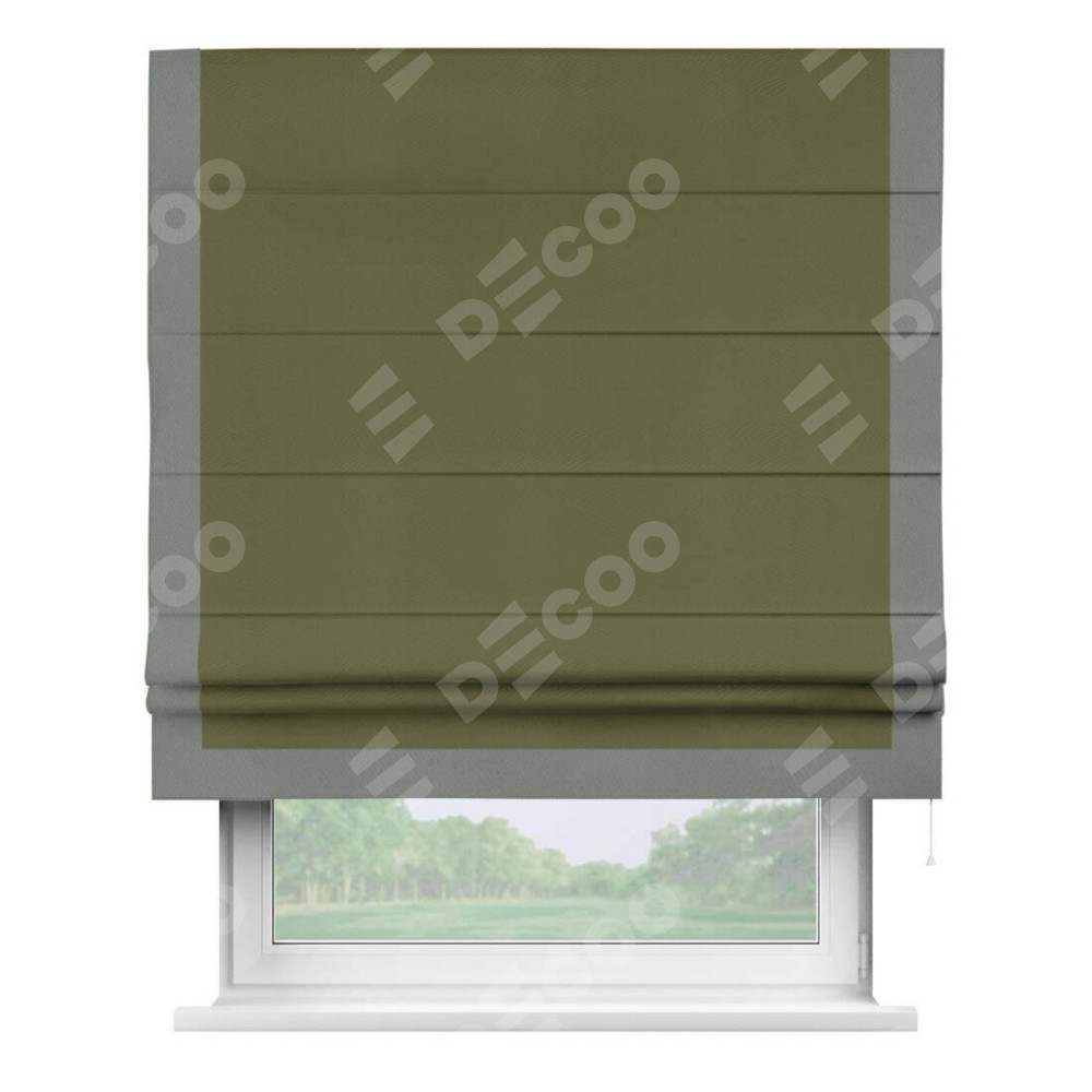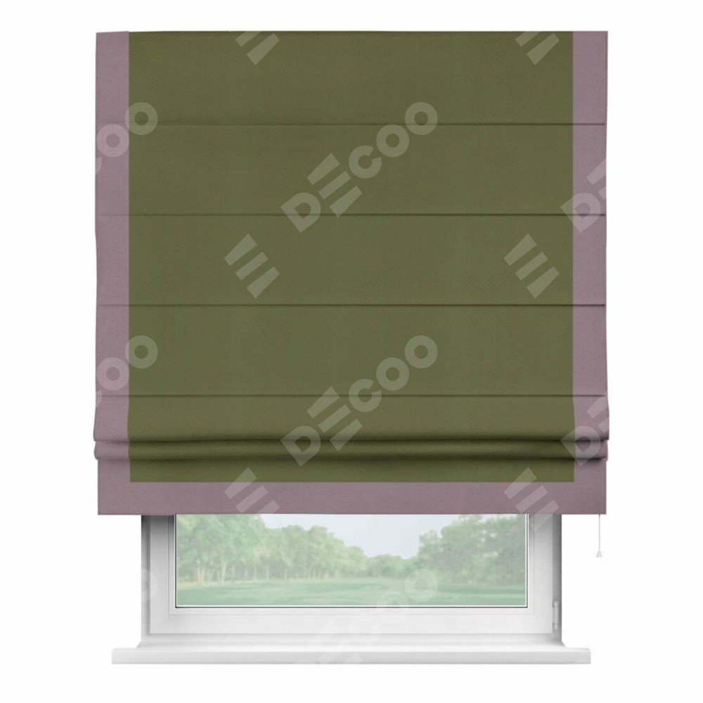 Римская штора производителя «Cortin», используется для проёма, пошита из ткани блэкаут однотонный зелёный, артикул ткани 81859. Отделка шторы кантом «Виктория», ткань для канта используется из блэкаута однотонного разной расцветки на выбор. Имеет универсальный механизм и подходит для монтажа: на потолок, на стену и в нишу.