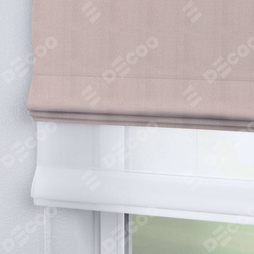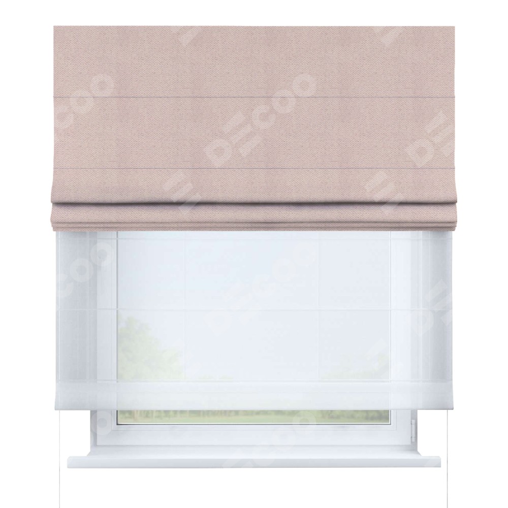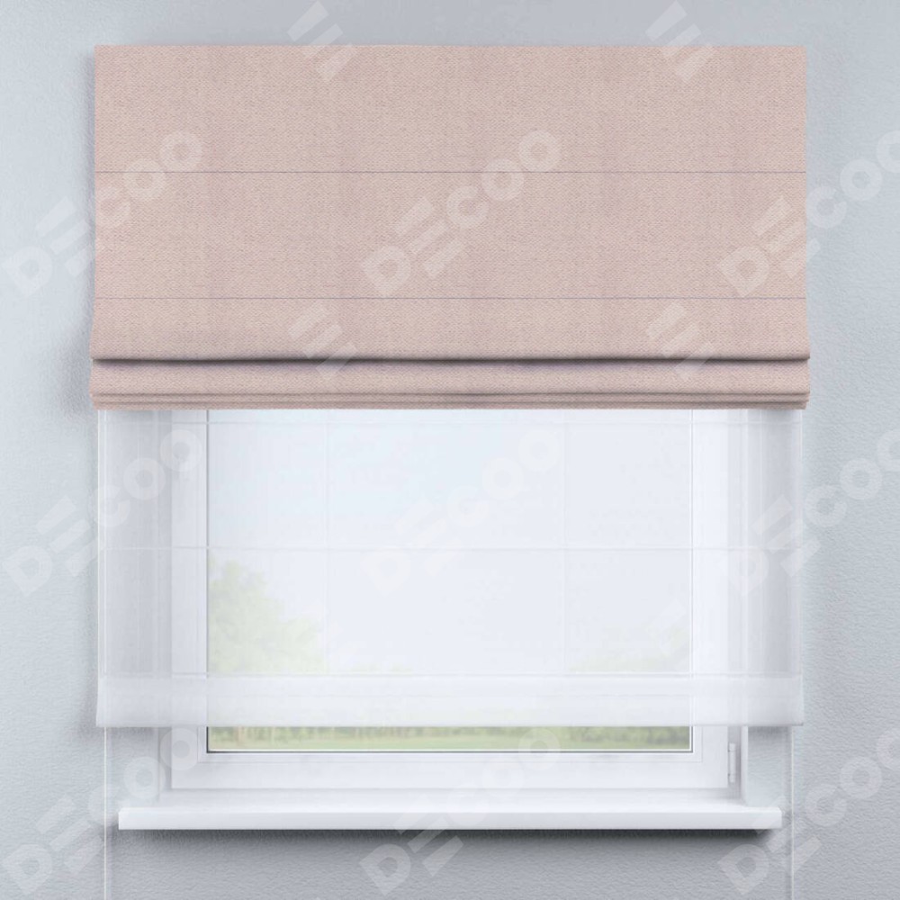 Римская штора день-ночь производителя «Cortin», используется для проёма, пошита из двух полотен, с лицевой стороны блэкаут тиснение с блеском сиреневый артикул 34649, вторая ткань тюль (по стандарту комплектуется тюль белого цвета артикул V-01). Изнаночная сторона основного материала черного цвета, что обеспечивает необходимую светонепроницаемость. Имеет универсальный механизм и подходит для монтажа: на потолок, на стену и в нишу.