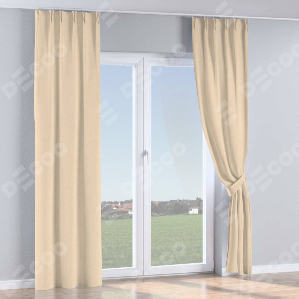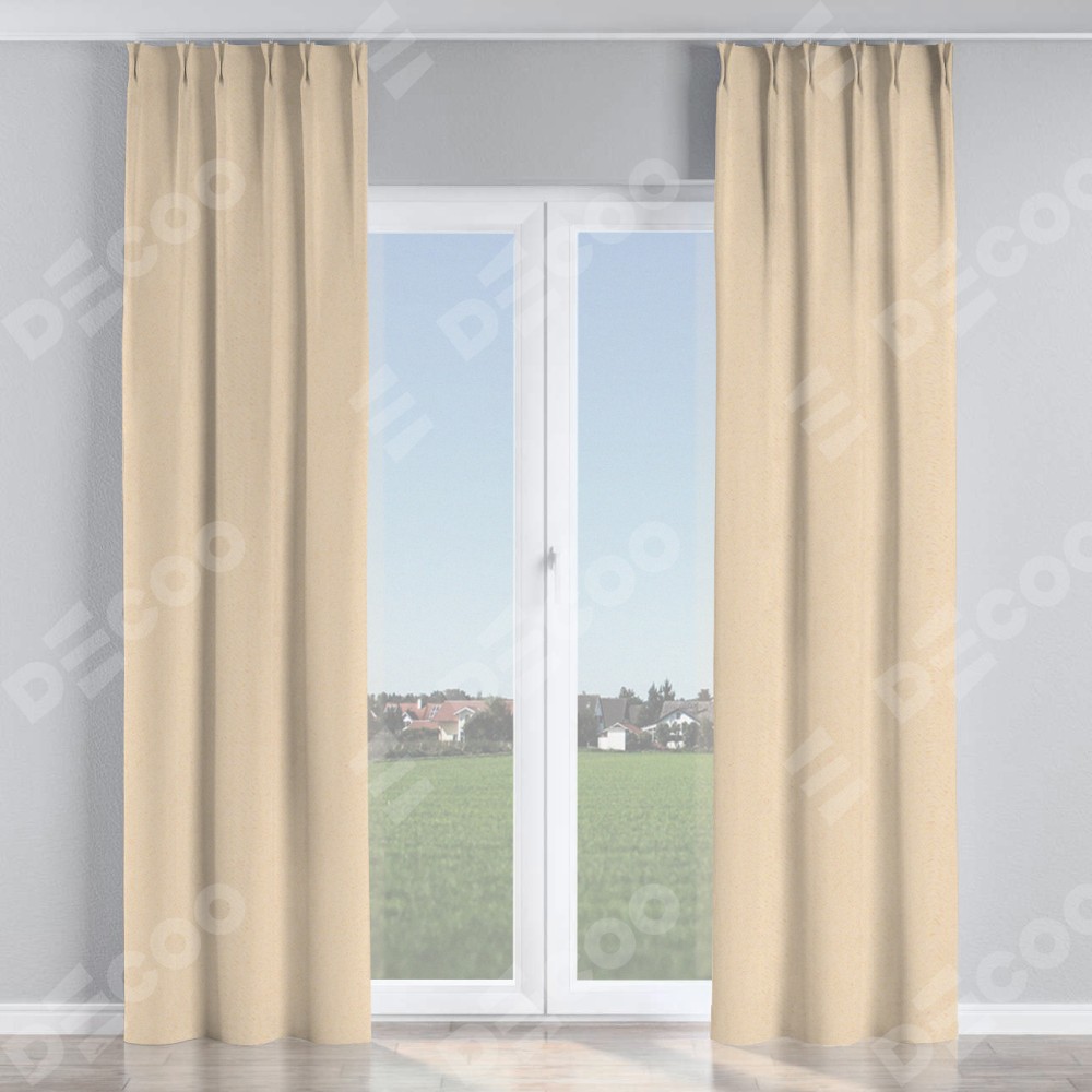 Комплект прямых штор, от производителя «Cortin», пошиты из ткани блэкаут с блеском бежевый, артикул ткани 34627. С изнаночной стороны в верхней части штор пристрачивается шторная лента с декоративными складками «Кустик». Обратная сторона основного материала черного цвета, что обеспечивает необходимую светонепроницаемость. Для создания элегантных складок прямые шторы шьются по стандарту с коэффициентом 1:2 (на 100 см. ширины проёма 200 см. ширины ткани).