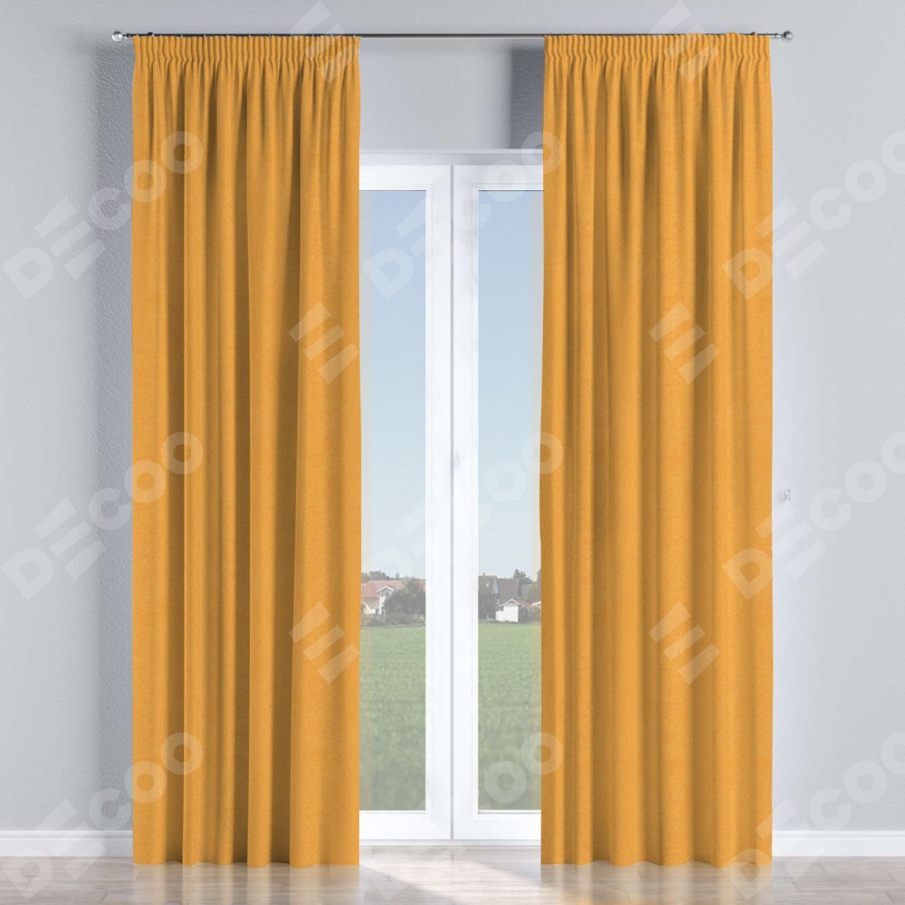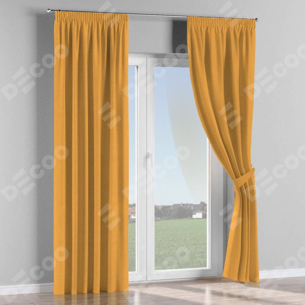 Комплект прямых штор, от производителя «Cortin», пошиты из ткани блэкаут с блеском золотой, артикул ткани 34626. С изнаночной стороны в верхней части штор пристрачивается шторная лента с декоративными складками «Карандаш». Обратная сторона основного материала черного цвета, что обеспечивает необходимую светонепроницаемость. Для создания элегантных складок прямые шторы шьются по стандарту с коэффициентом 1:2 (на 100 см. ширины проёма 200 см. ширины ткани).