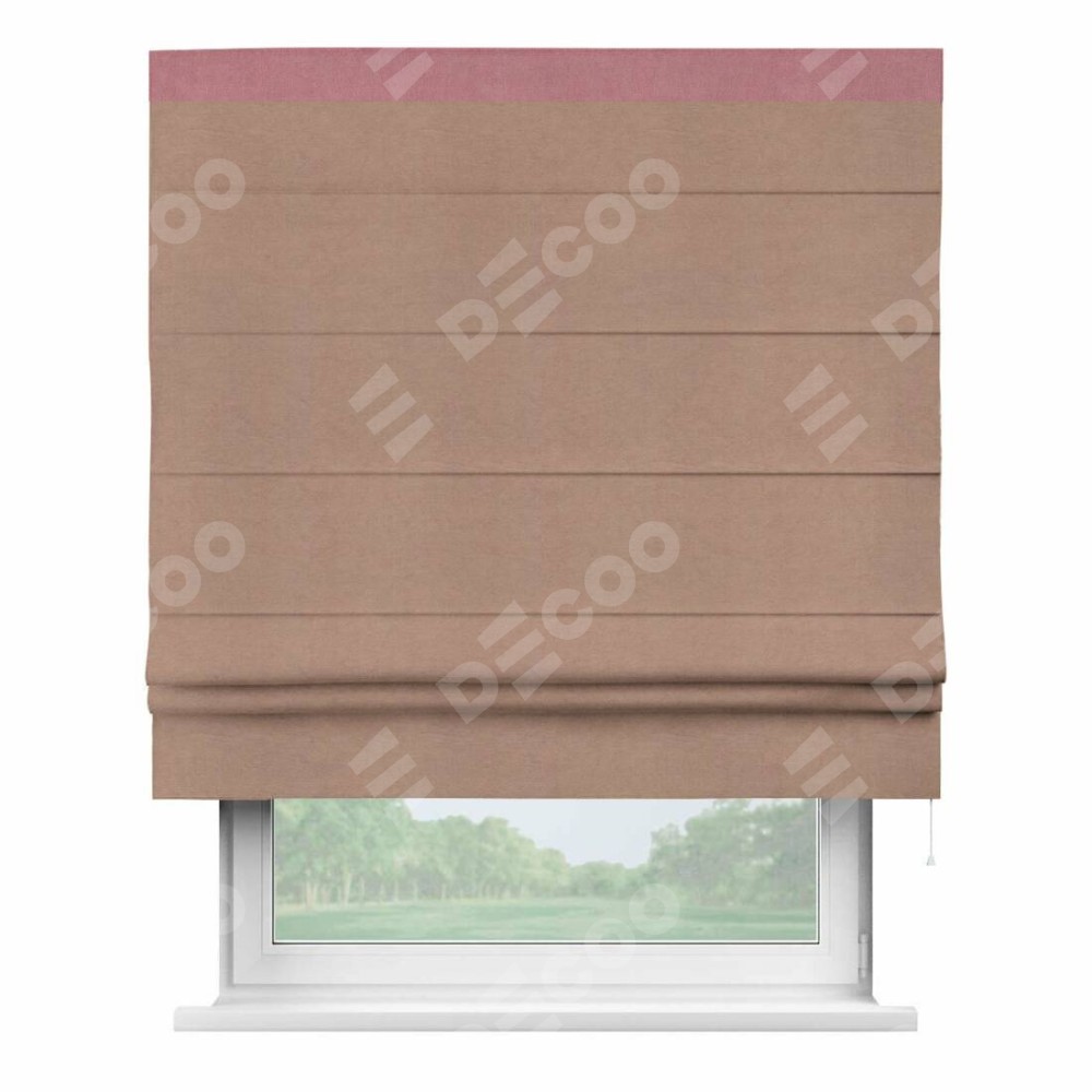 Римская штора производителя «Cortin», используется для проёма, пошита из ткани вельвет брусничный джем, артикул ткани 17750. Отделка шторы кантом «Кинг», ткань для канта используется из вельвета разной расцветки на выбор. Имеет универсальный механизм и подходит для монтажа: на потолок, на стену и в нишу.
