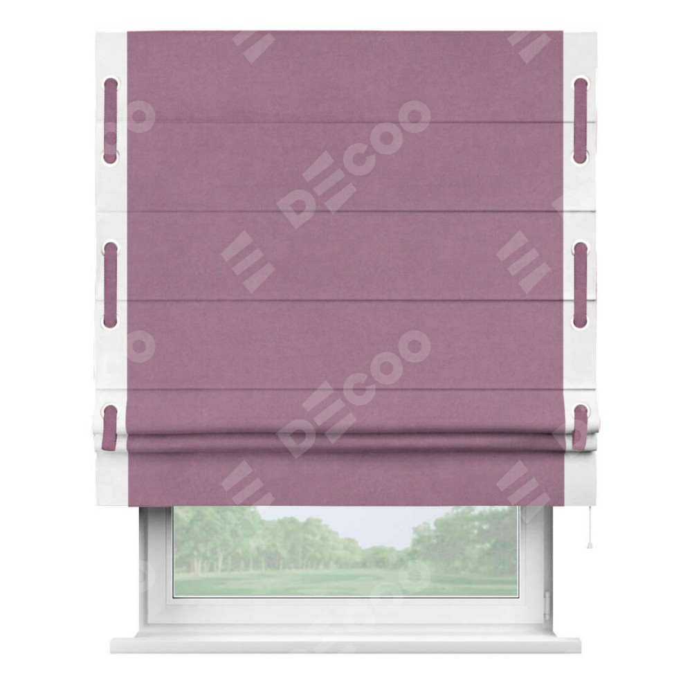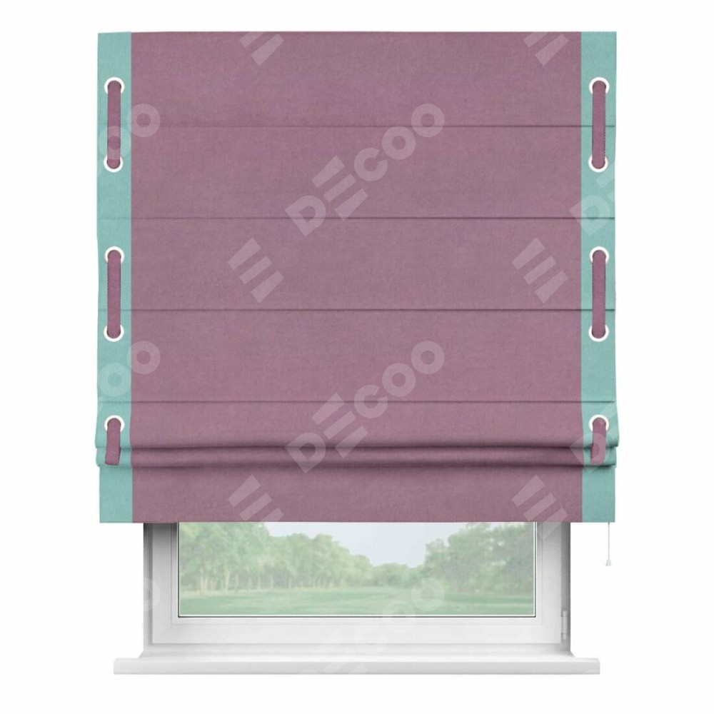 Римская штора производителя «Cortin», используется для проёма, пошита из ткани вельвет лиловый, артикул ткани 17752. Отделка шторы кантом «Стрим Дуо» на кантах расположены люверсы с пояском, ткань для канта используется из вельвета разной расцветки на выбор. Ткань для пояска обычно используется из основной ткани шторы, а так же можно сделать из любой расцветки по желанию. Имеет универсальный механизм и подходит для монтажа: на потолок, на стену и в нишу.