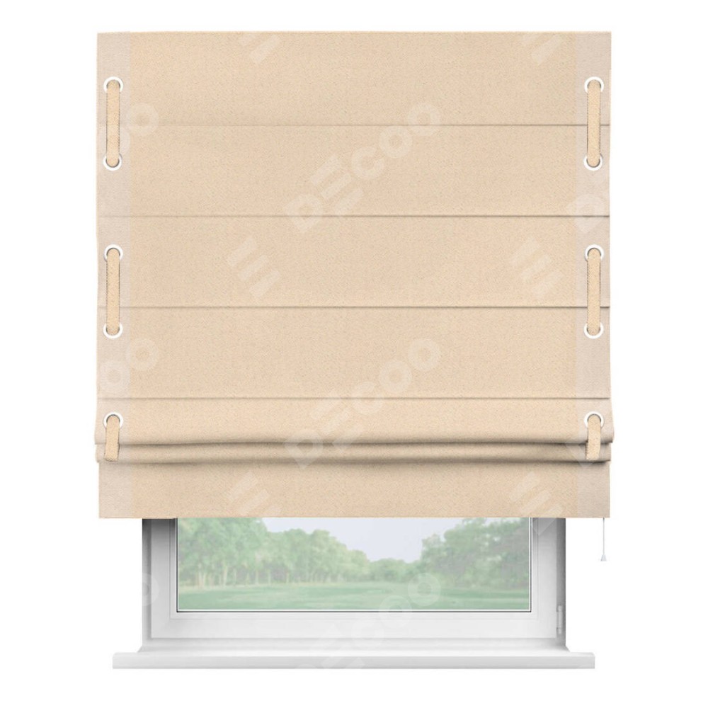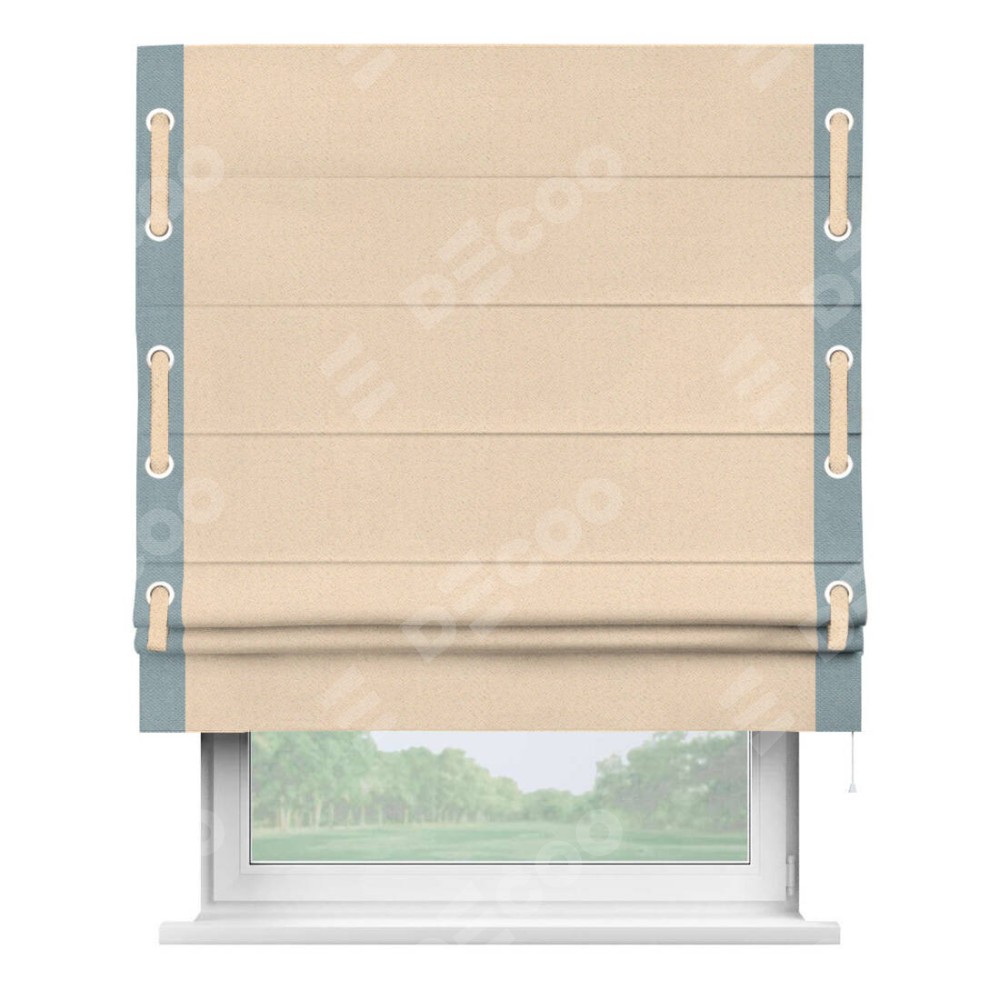 Римская штора производителя «Cortin», используется для проёма, пошита из ткани блэкаут с блеском бежевый, артикул 34627. Отделка шторы кантом «Стрим Дуо» на кантах расположены люверсы с пояском, ткань для канта используется блэкаут с блеском разной расцветки на выбор. Ткань для пояска обычно используется из основной ткани шторы, а так же можно сделать из любой расцветки по желанию. Изнаночная сторона материала черного цвета, что обеспечивает необходимую светонепроницаемость. Имеет универсальный механизм и подходит для монтажа: на потолок, на стену и в нишу.