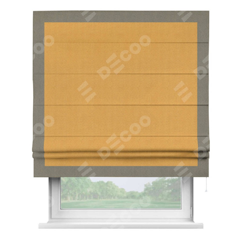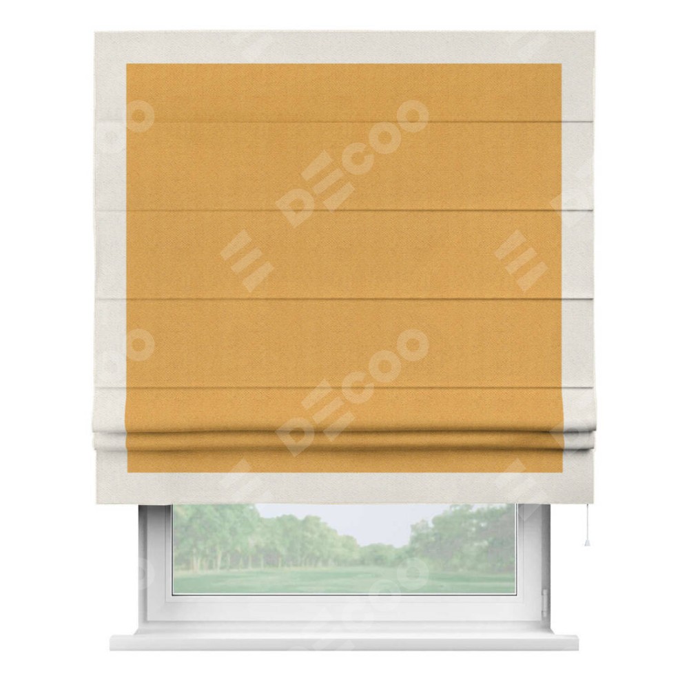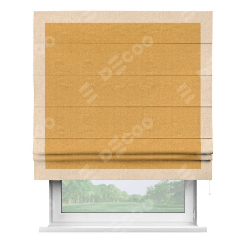 Римская штора производителя «Cortin», используется для проёма, пошита из ткани блэкаут с блеском золотой, артикул 34626. Отделка шторы кантом «Чесс», ткань для канта используется из блэкаута с блеском разной расцветки на выбор. Изнаночная сторона материала черного цвета, что обеспечивает необходимую светонепроницаемость. Имеет универсальный механизм и подходит для монтажа: на потолок, на стену и в нишу.