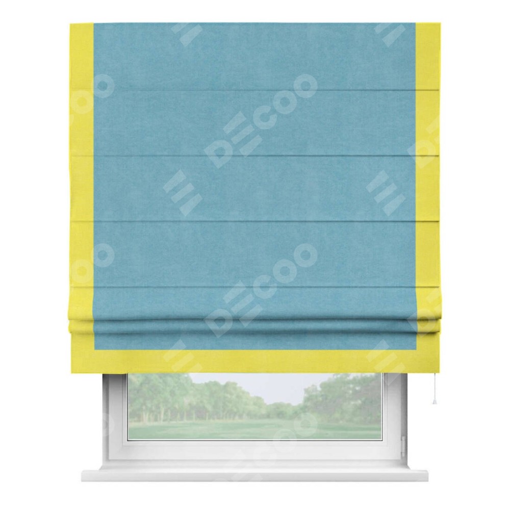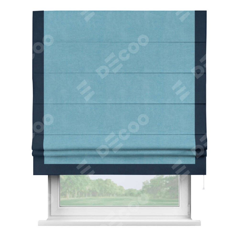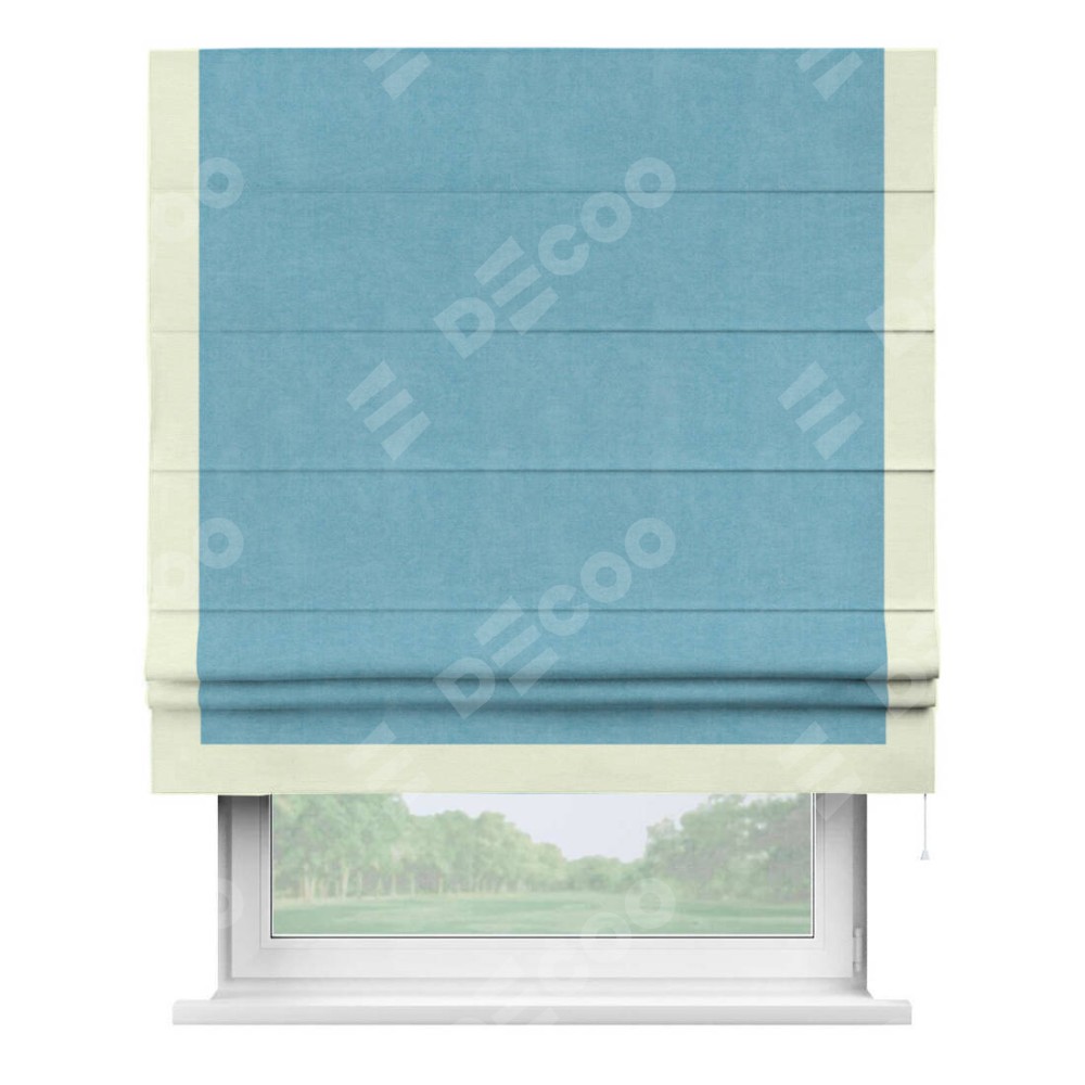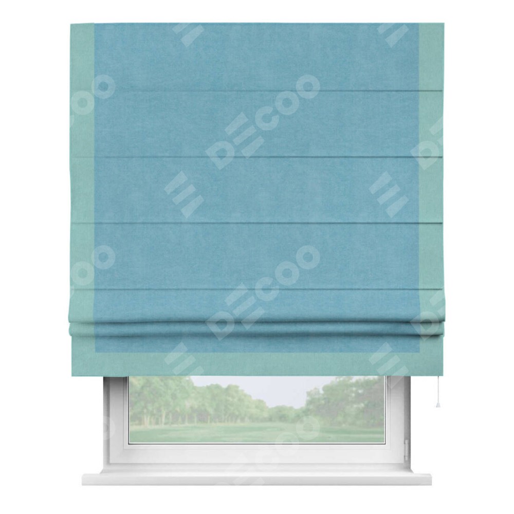 Римская штора производителя «Cortin», используется для проёма, пошита из ткани вельвет ментоловый, артикул ткани 10443. Отделка шторы кантом «Виктория», ткань для канта используется из вельвета разной расцветки на выбор. Имеет универсальный механизм и подходит для монтажа: на потолок, на стену и в нишу.