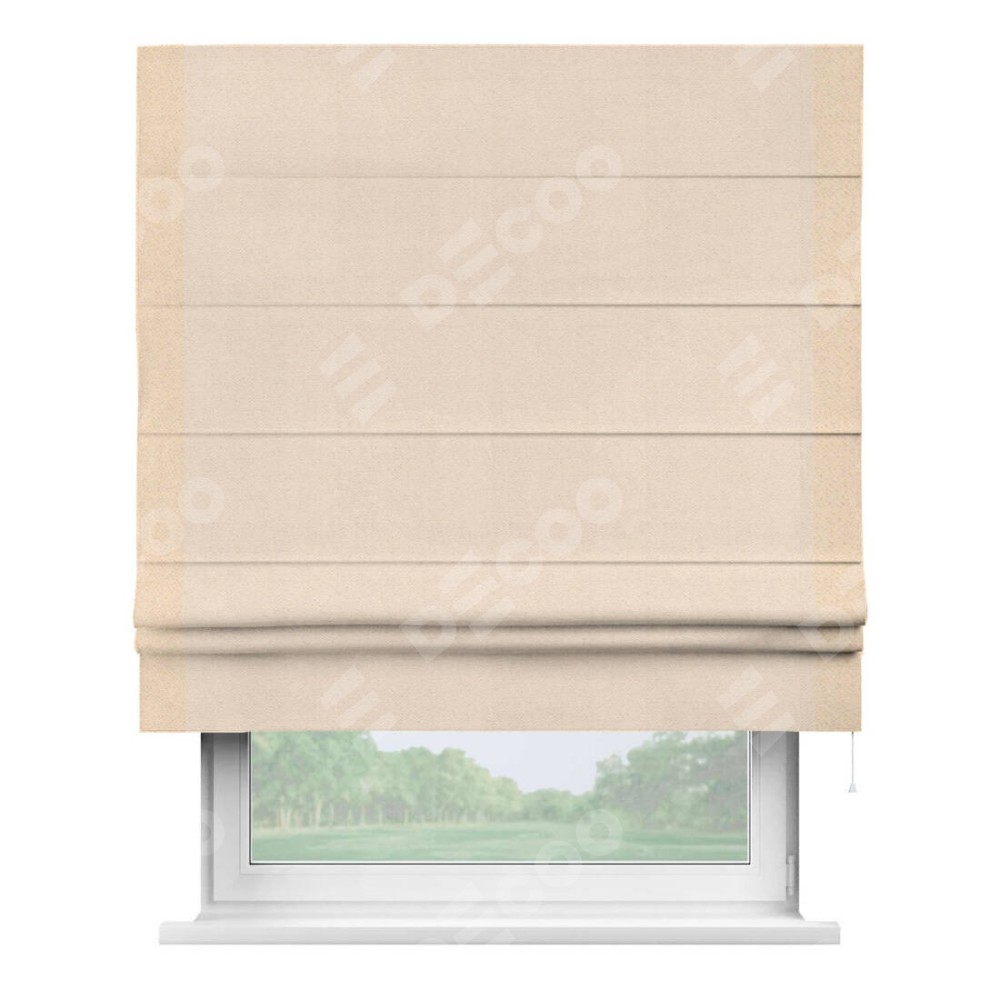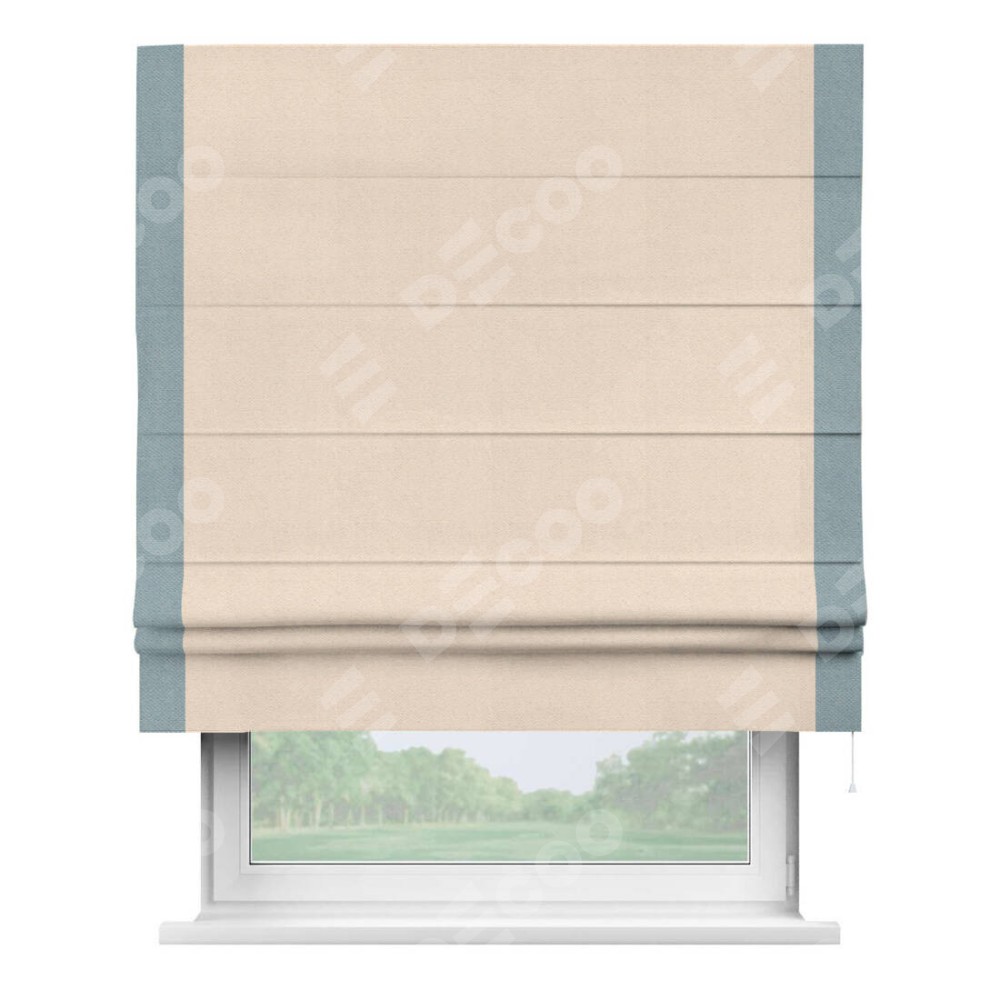 Римская штора производителя «Cortin», используется для проёма, пошита из ткани блэкаут с блеском розовая пудра, артикул 34632. Отделка шторы кантом «Стрим Дуо», ткань для канта используется из блэкаута с блеском разной расцветки на выбор. Изнаночная сторона материала черного цвета, что обеспечивает необходимую светонепроницаемость. Имеет универсальный механизм и подходит для монтажа: на потолок, на стену и в нишу.