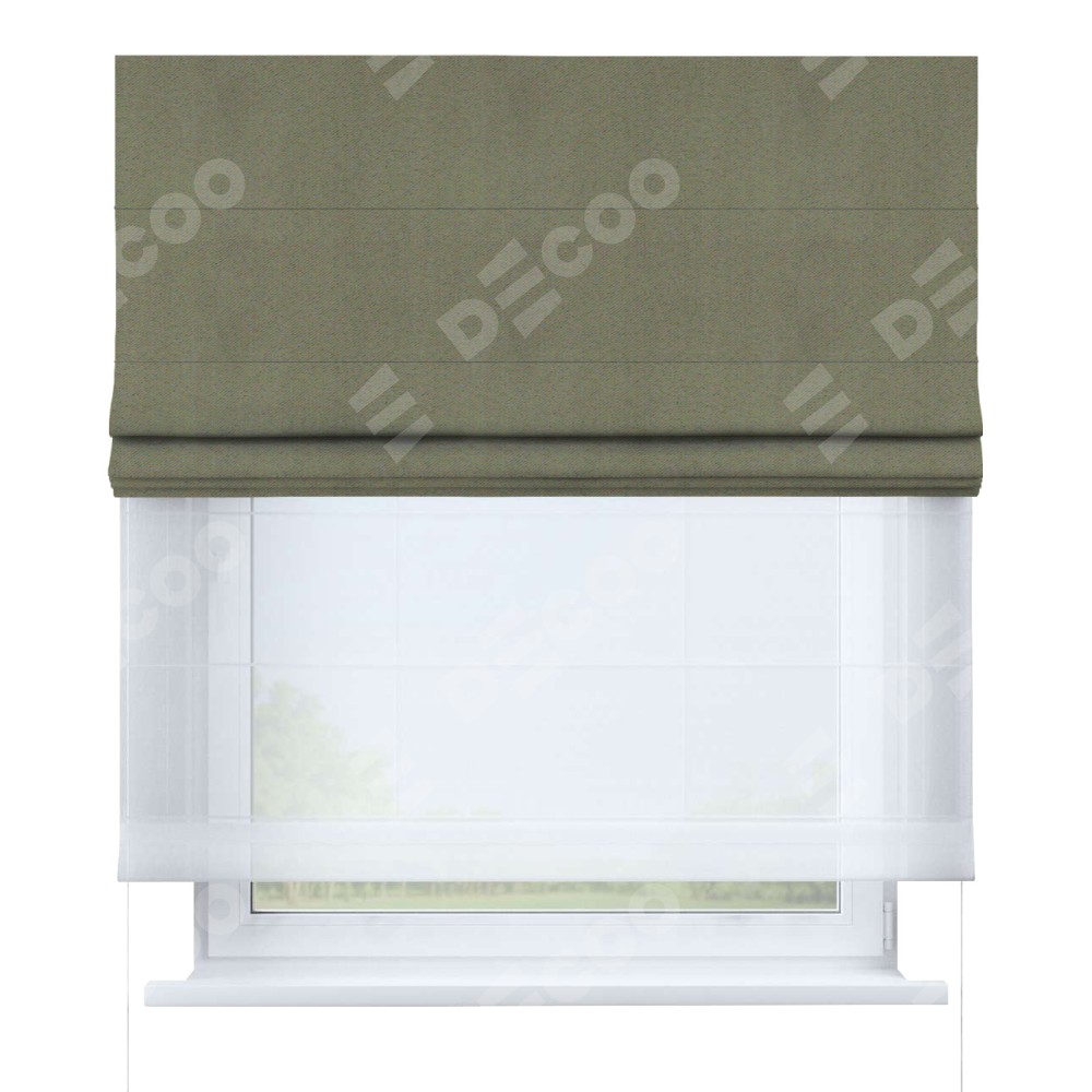 Римская штора день-ночь производителя «Cortin», используется для проёма, пошита из двух полотен, с лицевой стороны блэкаут однотонный серо-коричневый артикул 29568, вторая ткань тюль (по стандарту комплектуется тюль белого цвета артикул V-01). Имеет универсальный механизм и подходит для монтажа: на потолок, на стену и в нишу.