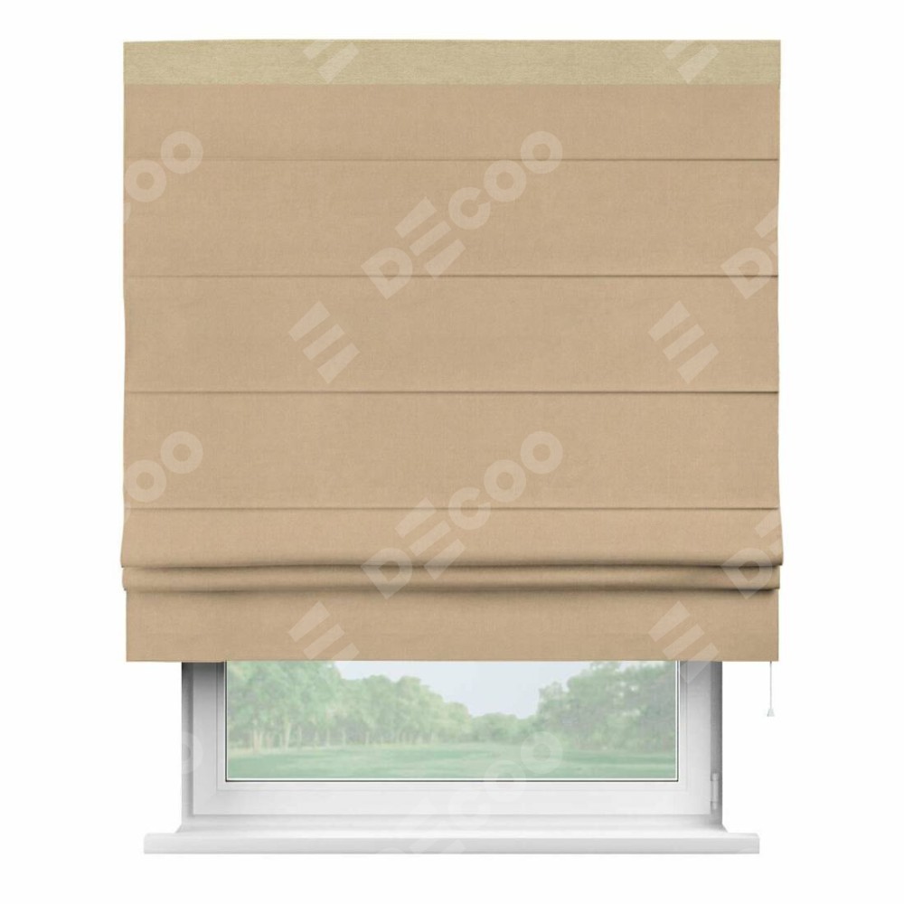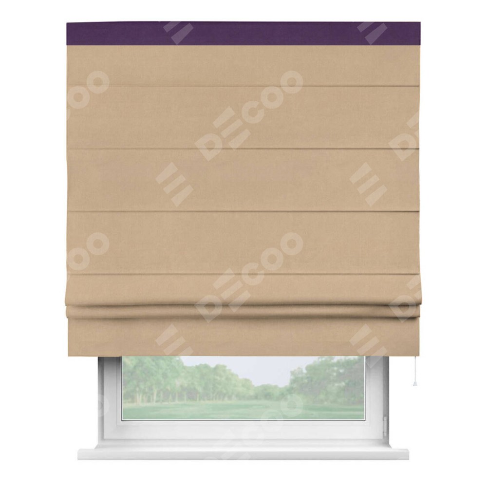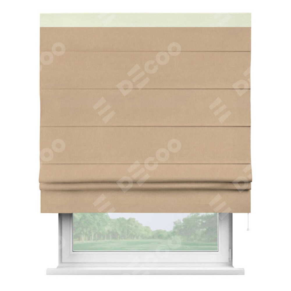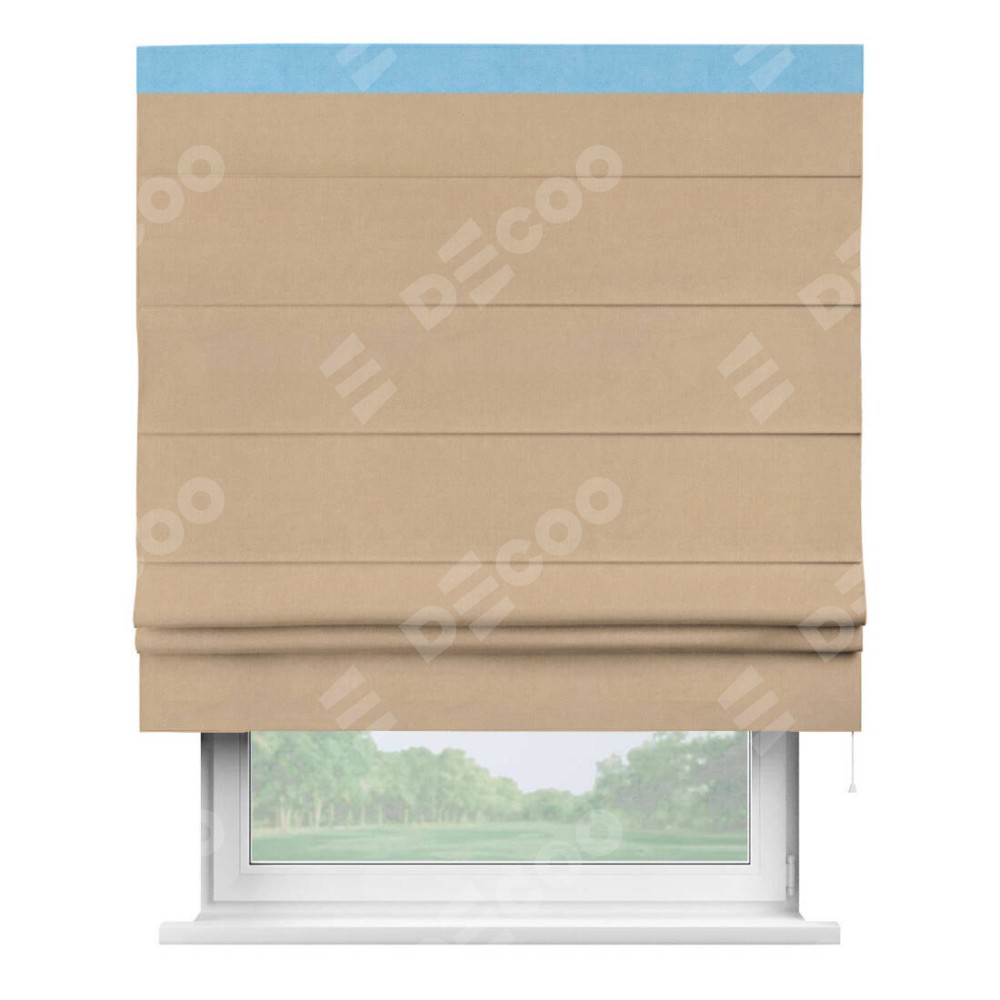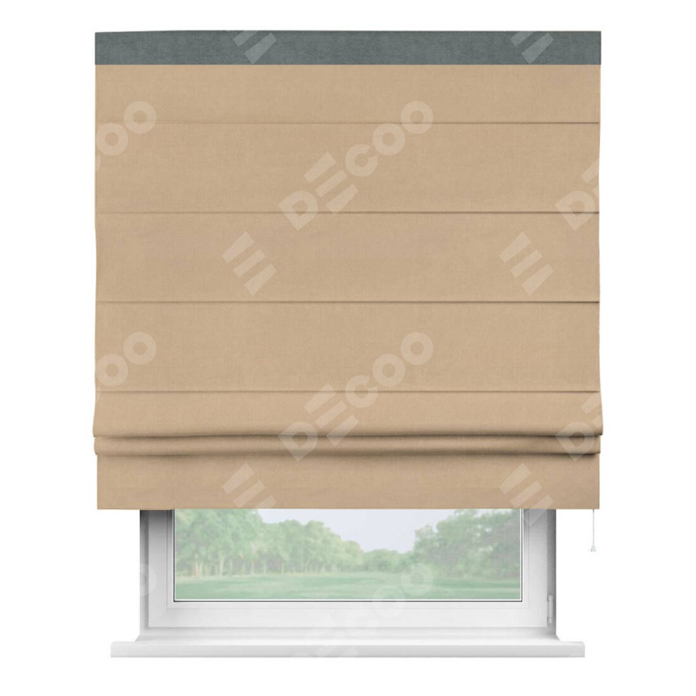 Римская штора производителя «Cortin», используется для проёма, пошита из ткани вельвет песочный, артикул ткани 17740. Отделка шторы кантом «Кинг», ткань для канта используется из вельвета разной расцветки на выбор. Имеет универсальный механизм и подходит для монтажа: на потолок, на стену и в нишу.
