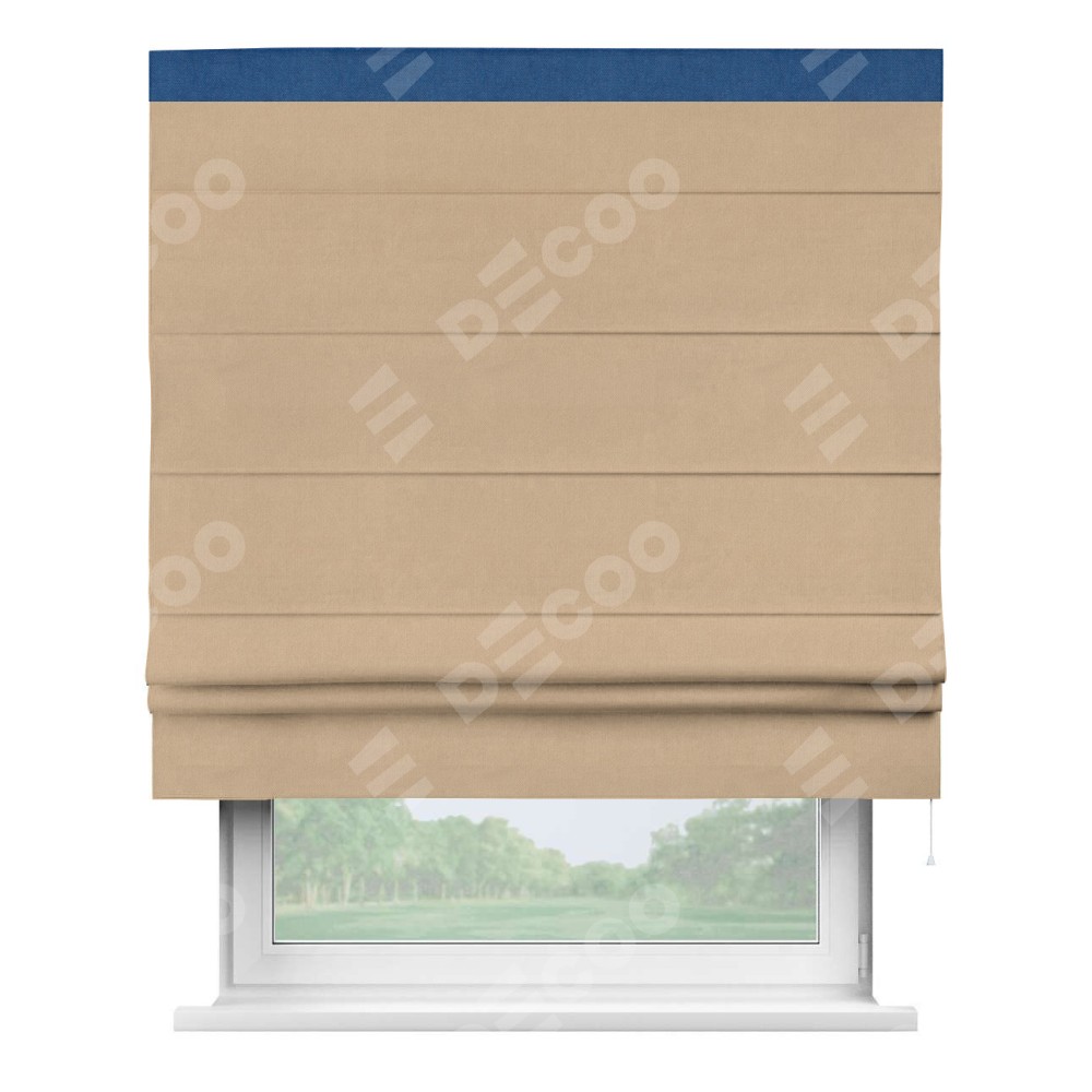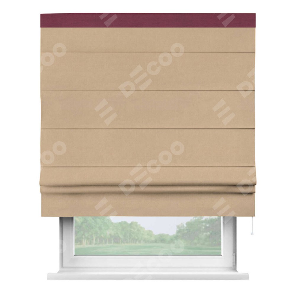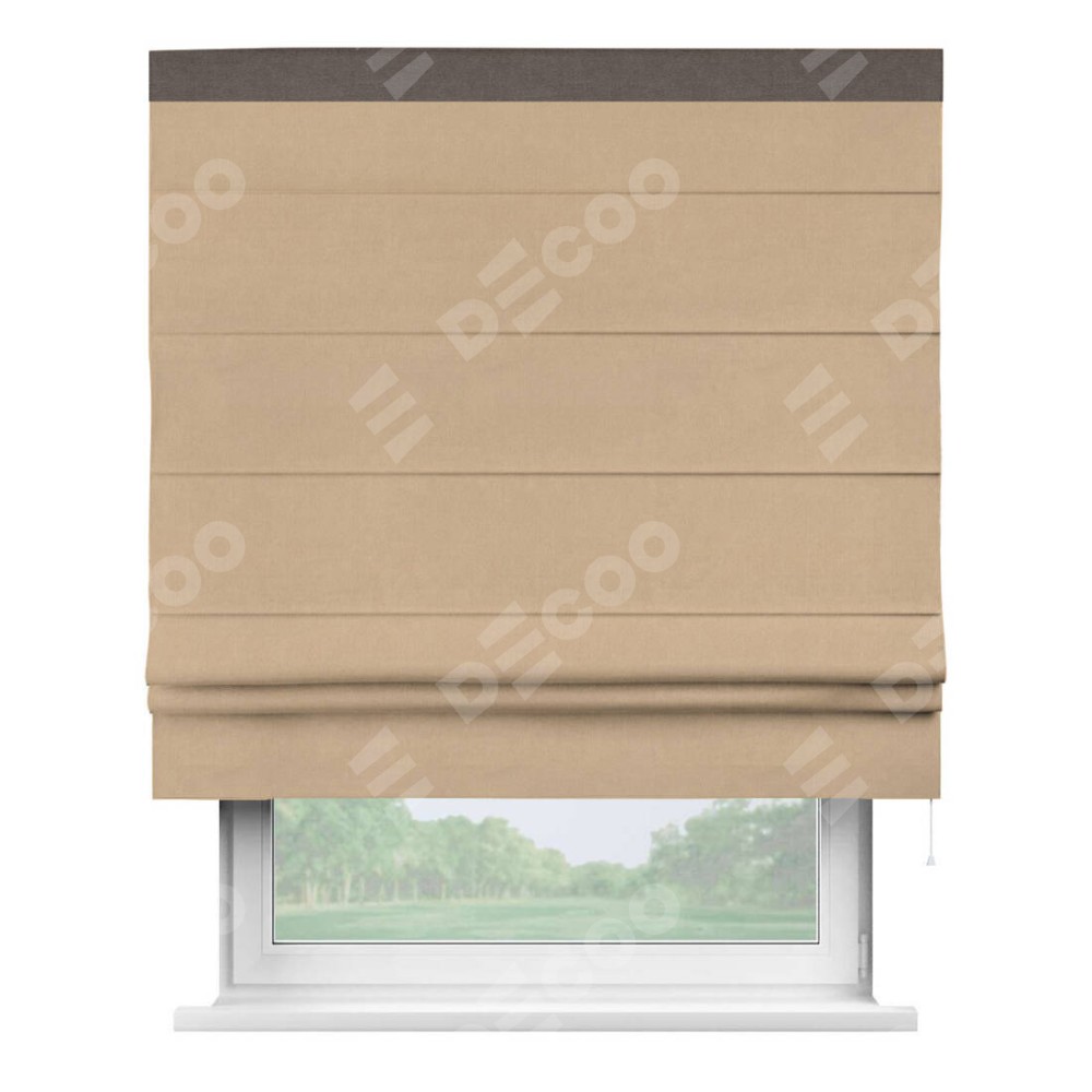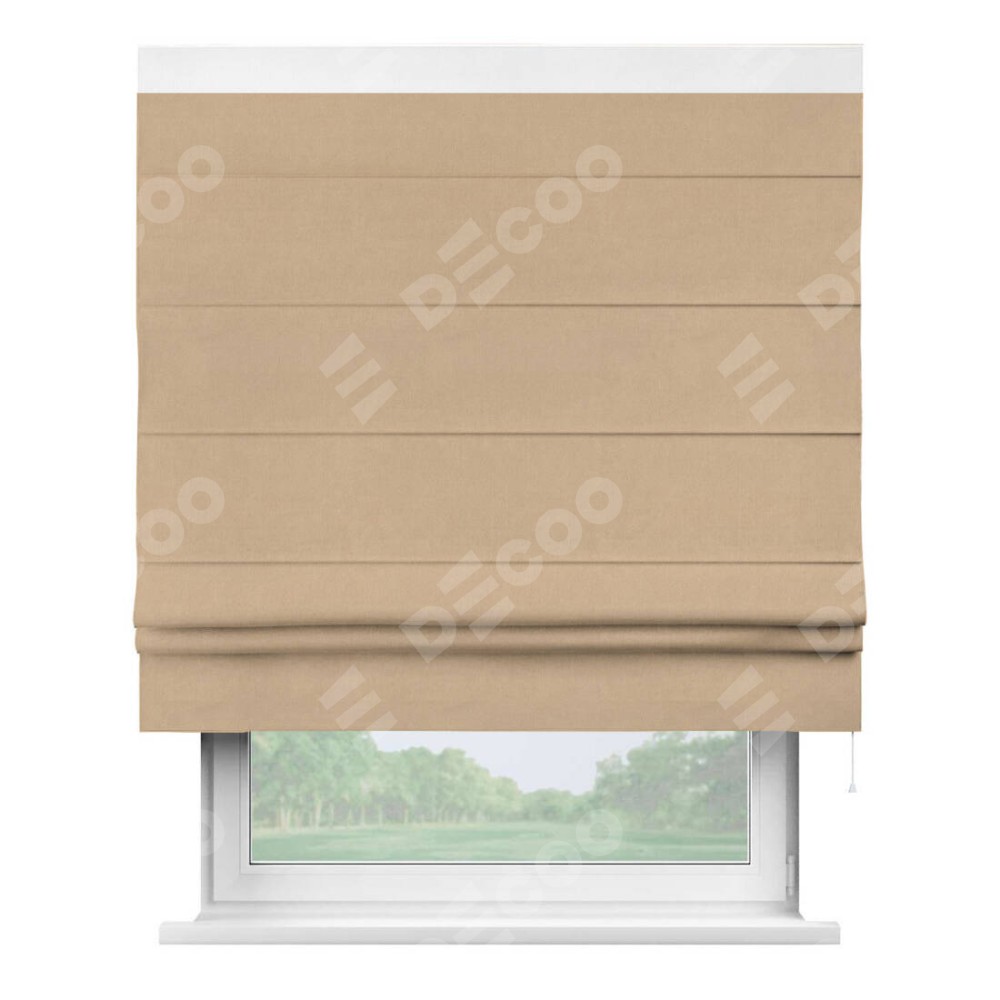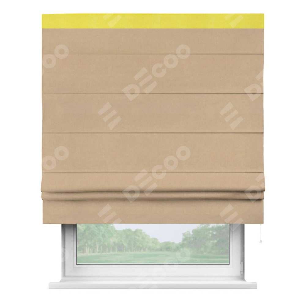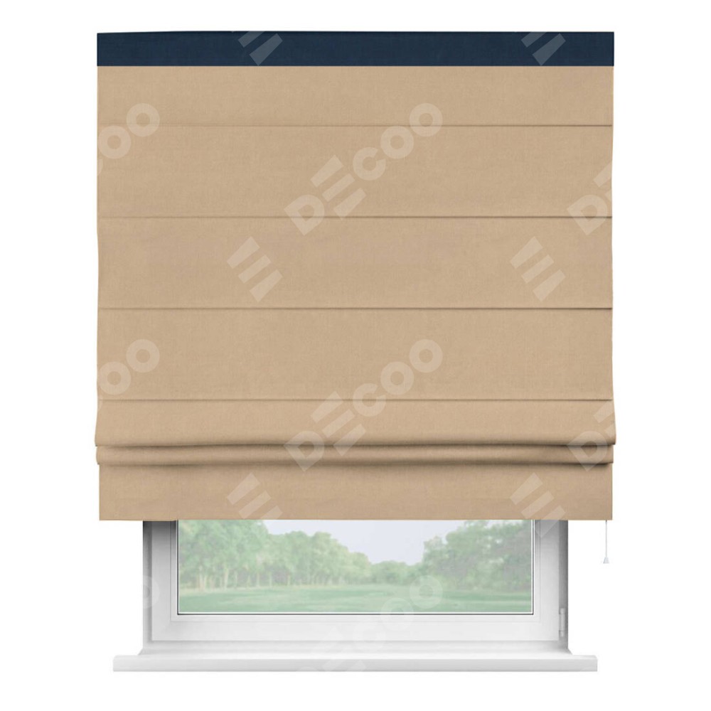 Римская штора производителя «Cortin», используется для проёма, пошита из ткани вельвет песочный, артикул ткани 17740. Отделка шторы кантом «Кинг», ткань для канта используется из вельвета разной расцветки на выбор. Имеет универсальный механизм и подходит для монтажа: на потолок, на стену и в нишу.