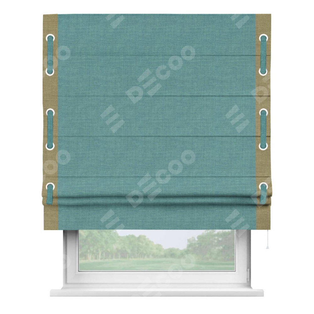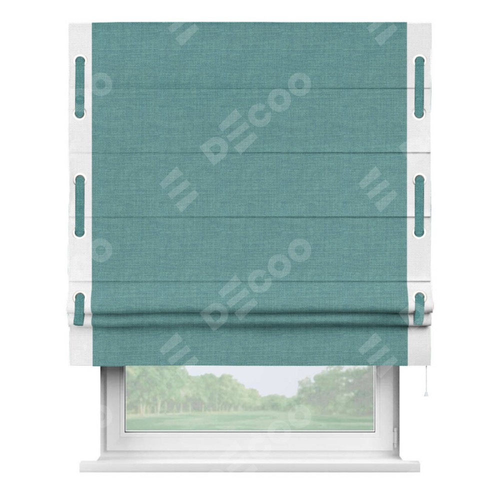 Римская штора производителя «Cortin», используется для проёма, пошита из ткани лён бирюза, артикул 7446. Отделка шторы кантом «Стрим Дуо» на кантах расположены люверсы с пояском, ткань для канта используется из льна разной расцветки на выбор. Ткань для пояска обычно используется из основной ткани шторы, а так же можно сделать из любой расцветки по желанию. Имеет универсальный механизм и подходит для монтажа: на потолок, на стену и в нишу.
