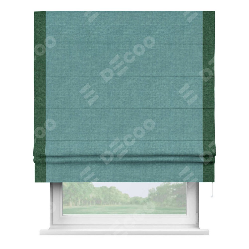 Римская штора производителя «Cortin», используется для проёма, пошита из ткани лён бирюза, артикул 7446. Отделка шторы кантом «Стрим Дуо», ткань для канта используется из льна разной расцветки на выбор. Имеет универсальный механизм и подходит для монтажа: на потолок, на стену и в нишу.