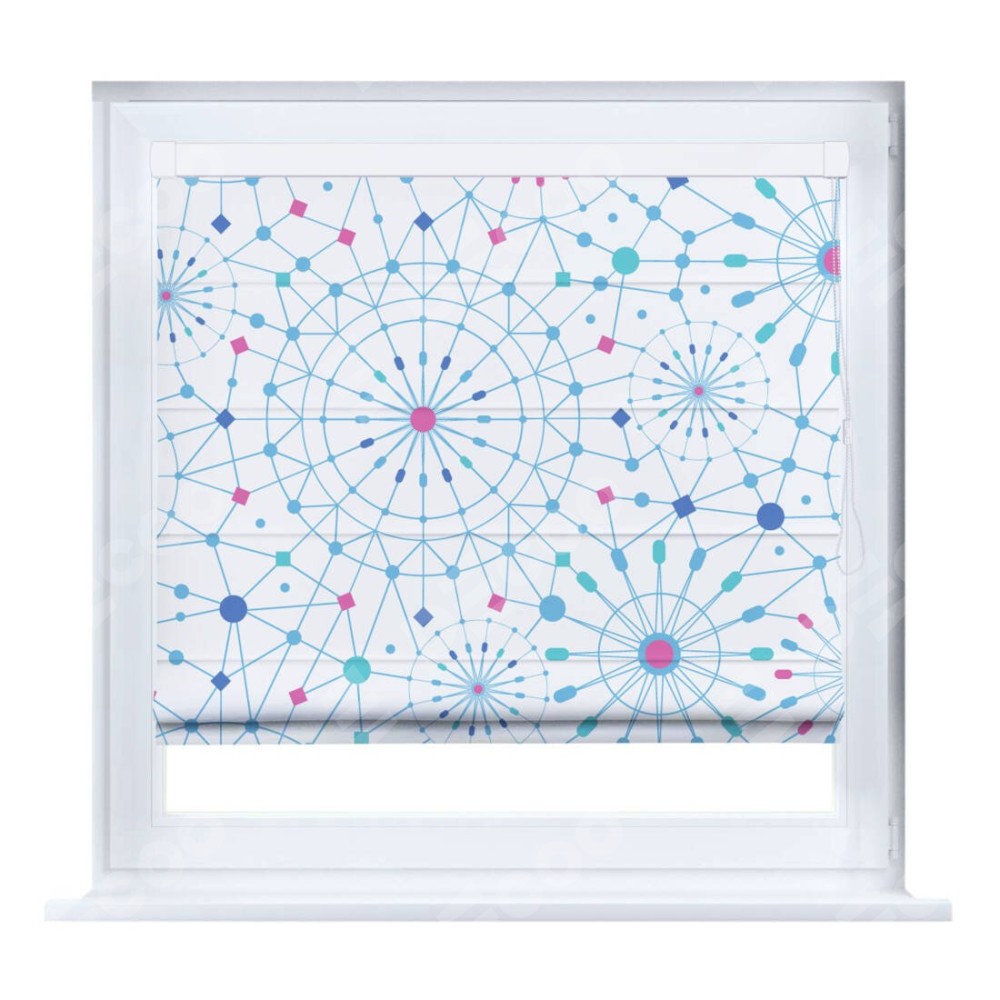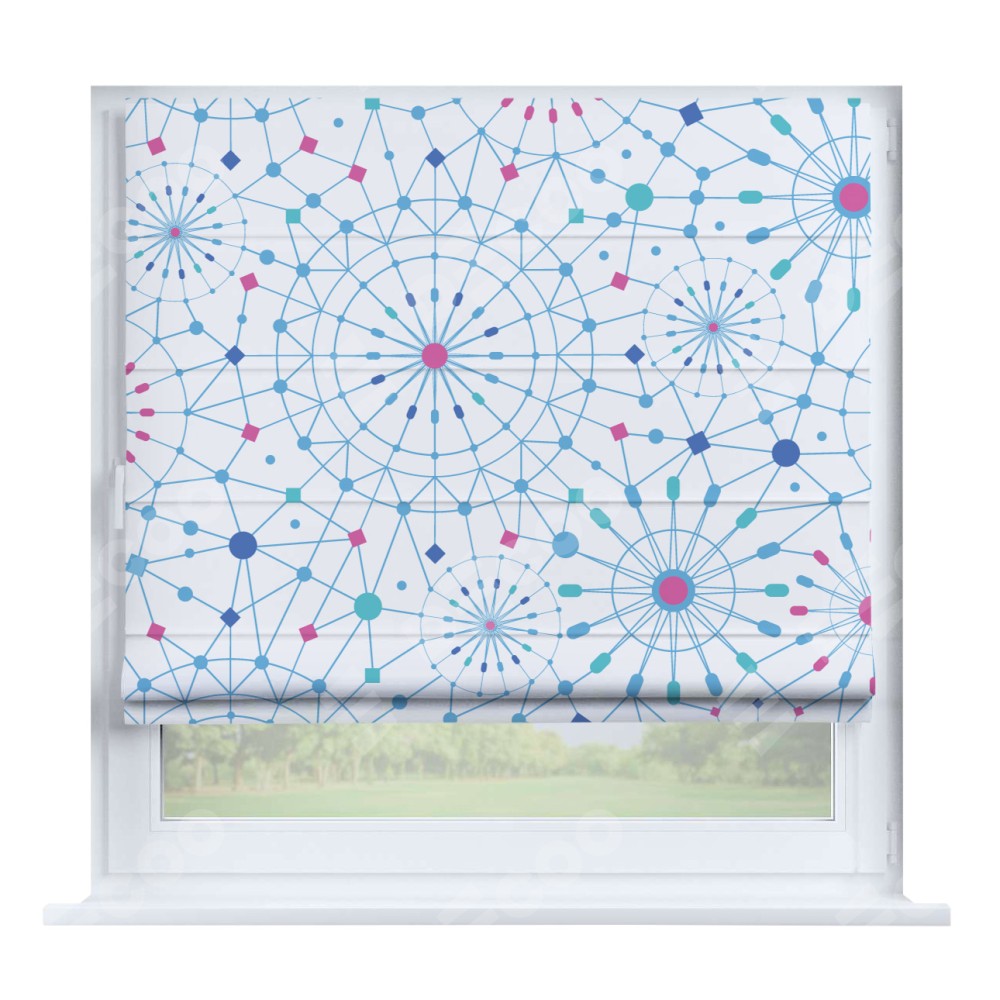 Римская штора производителя «Cortin», устанавливается на створку окна, пошита из ткани блэкаут с нанесением сублимационной печати «Круги и линии». Штора шьётся по индивидуальным размерам, для данного типа римской шторы возможная ширина от 35 до 150 см., высота до 250 см.