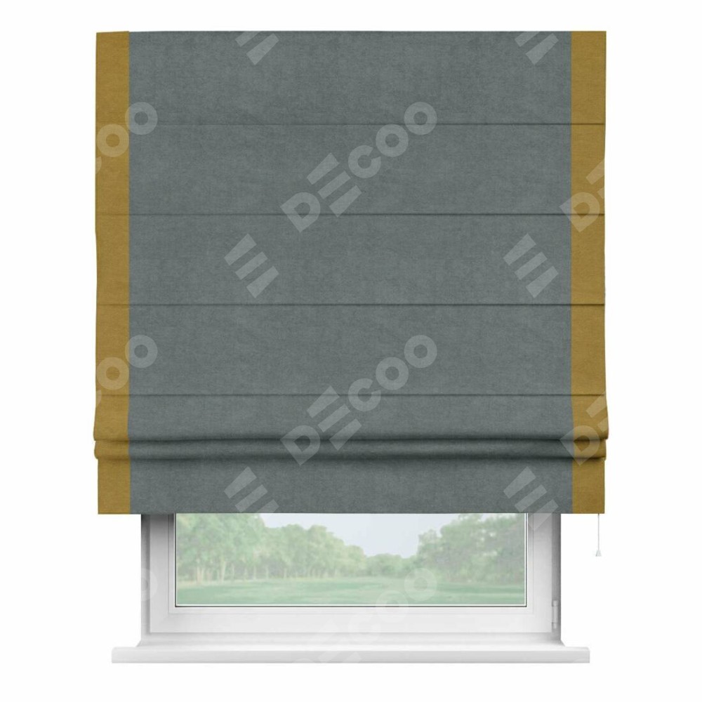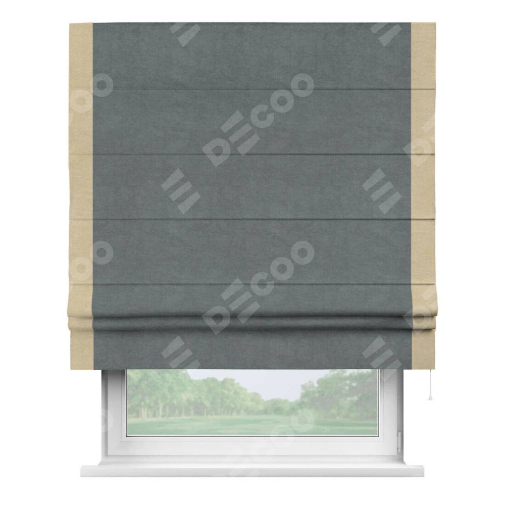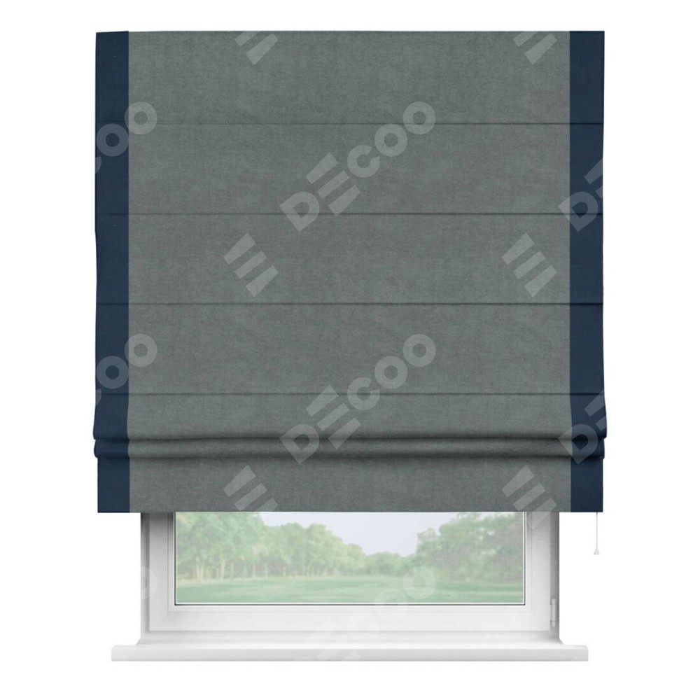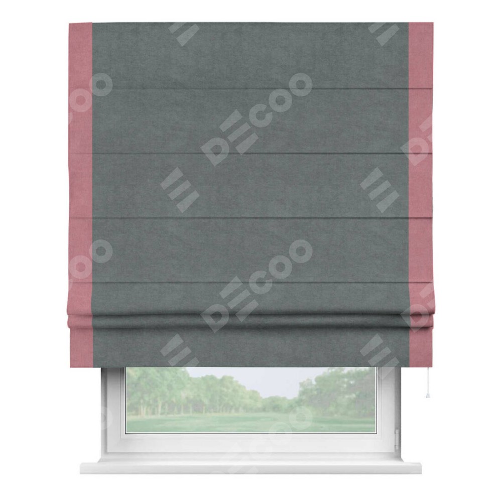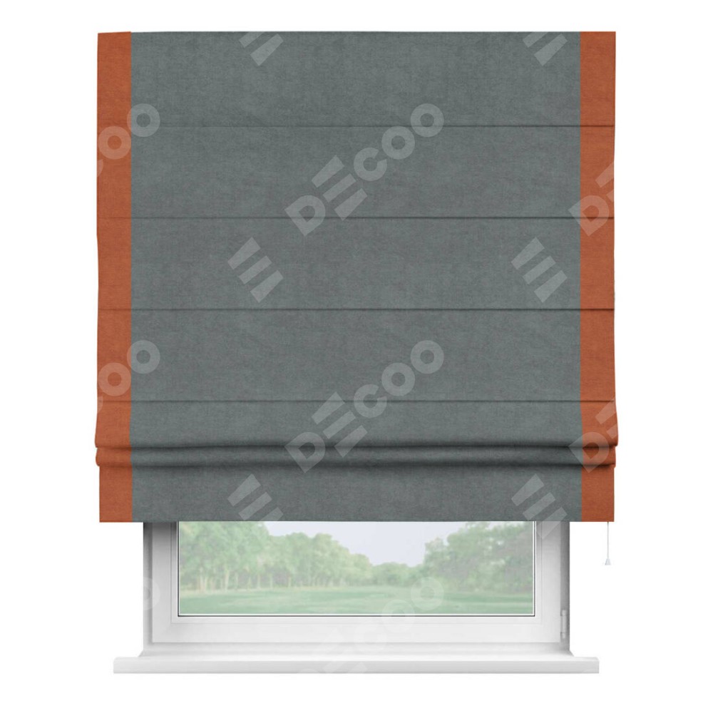 Римская штора производителя «Cortin», используется для проёма, пошита из ткани вельвет серый, артикул ткани 85542. Отделка шторы кантом «Стрим Дуо», ткань для канта используется из вельвета разной расцветки на выбор. Имеет универсальный механизм и подходит для монтажа: на потолок, на стену и в нишу.